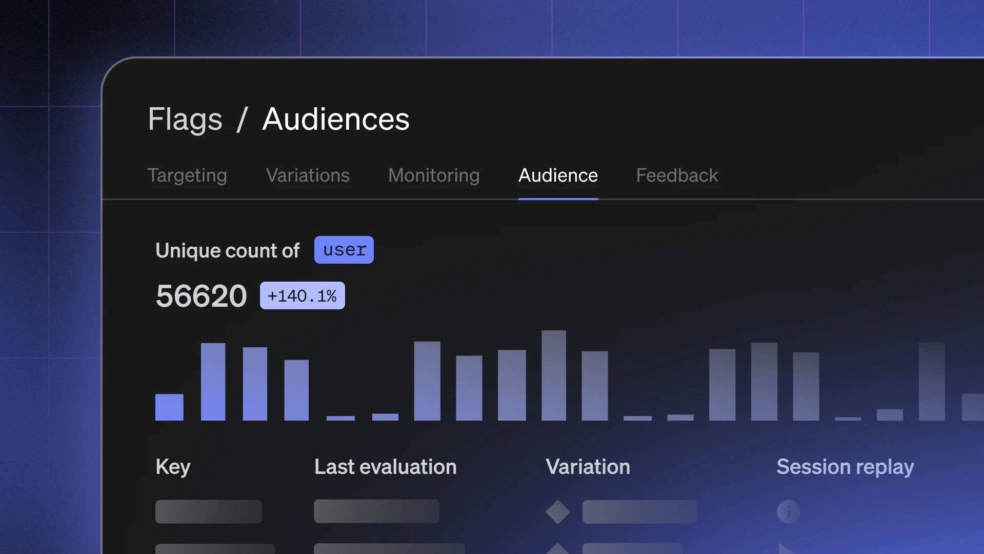 Imagine you’ve rolled out a new feature behind a flag, and your monitoring system reports an increase in 500 (Internal Server) errors. With Audience, you can open the flag, filter for users served the “treatment” variation, and instantly see which sessions encountered errors. You can even replay those sessions to see what actions led up to the issue, all from within LaunchDarkly.