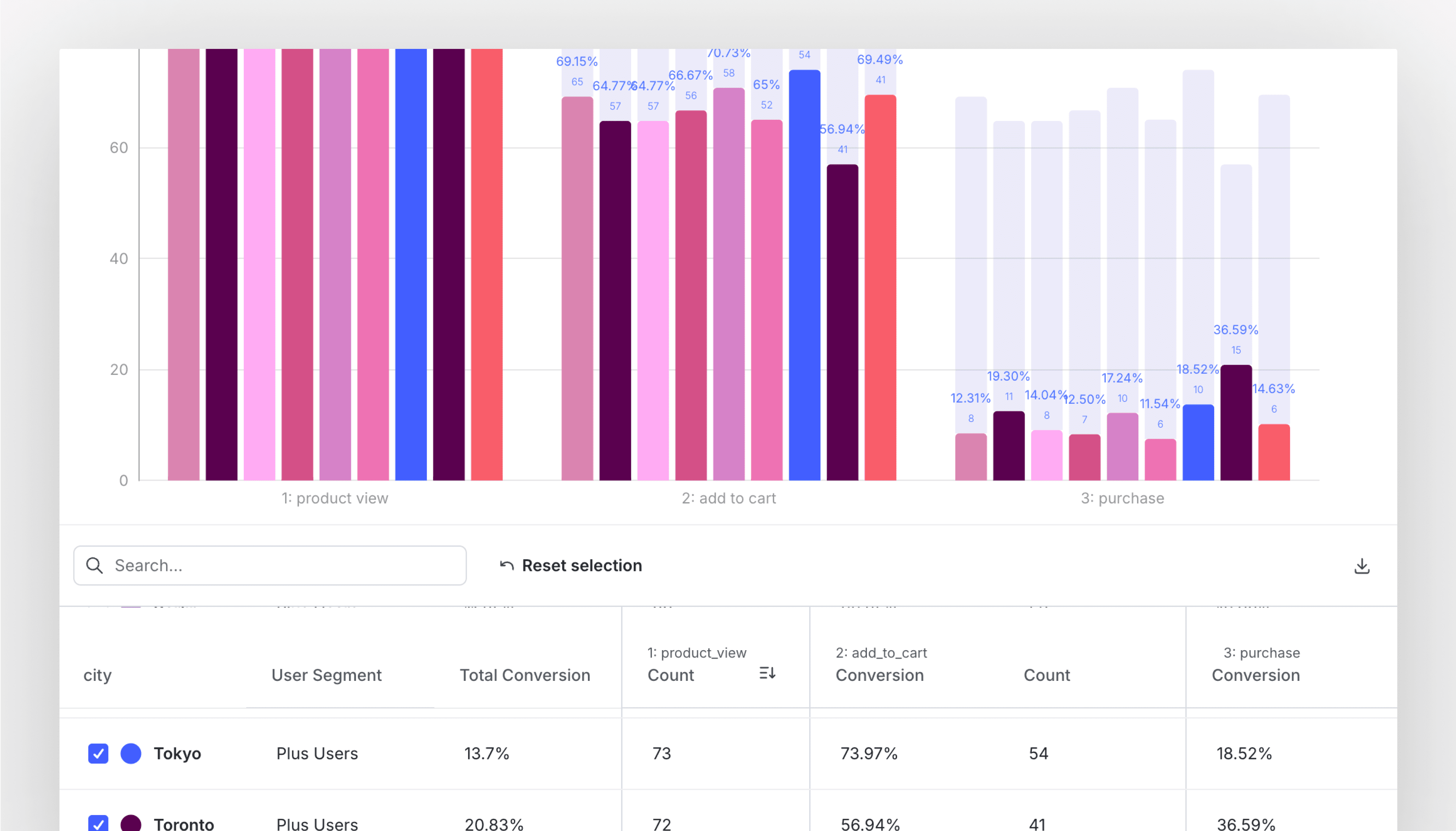 Tables are equally helpful for funnels. You can see step counts and conversion from the previous steps, all broken down by properties or cohorts. If the chart focuses on the top series, the table still shows every row, which helps you catch meaningful segments that might not appear in the visualization. A growth lead investigating a checkout drop-off can sort by step-one volume, scan step-two conversion by device type, and quickly identify where the friction is highest. From there, they can download the table and attach it to a ticket so engineering and design have the same data during triage.