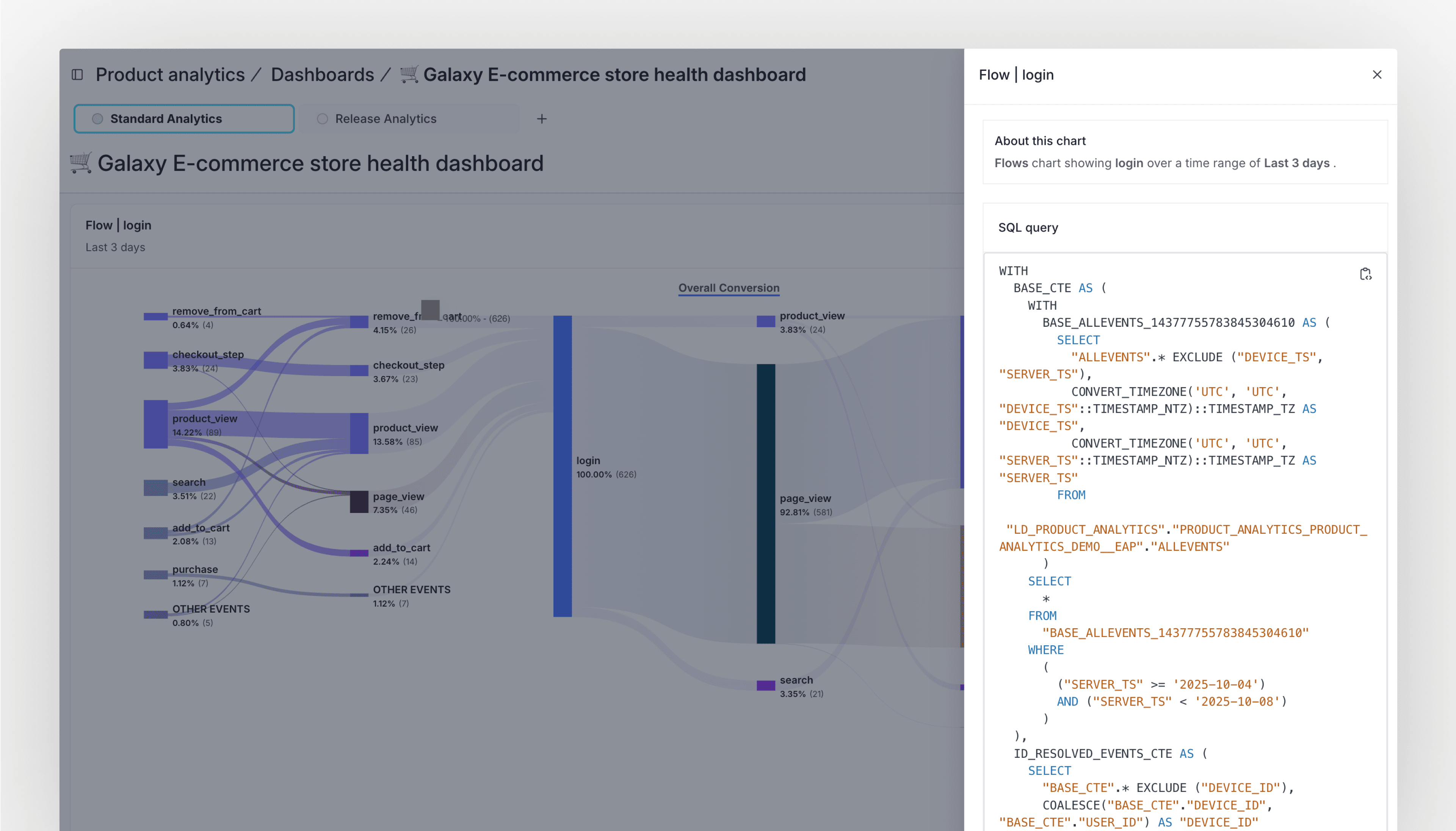 With Product Analytics, you can now view the SQL behind any chart in the platform and see data tables for trends and funnels. Trends help you see how key events change over time. Funnels show where users drop off across a defined sequence of steps. Together, these capabilities give teams transparency into how metrics are calculated, and the flexibility to explore the underlying numbers. You can validate definitions, debug faster, and export the details you need for deeper analysis or collaboration.
