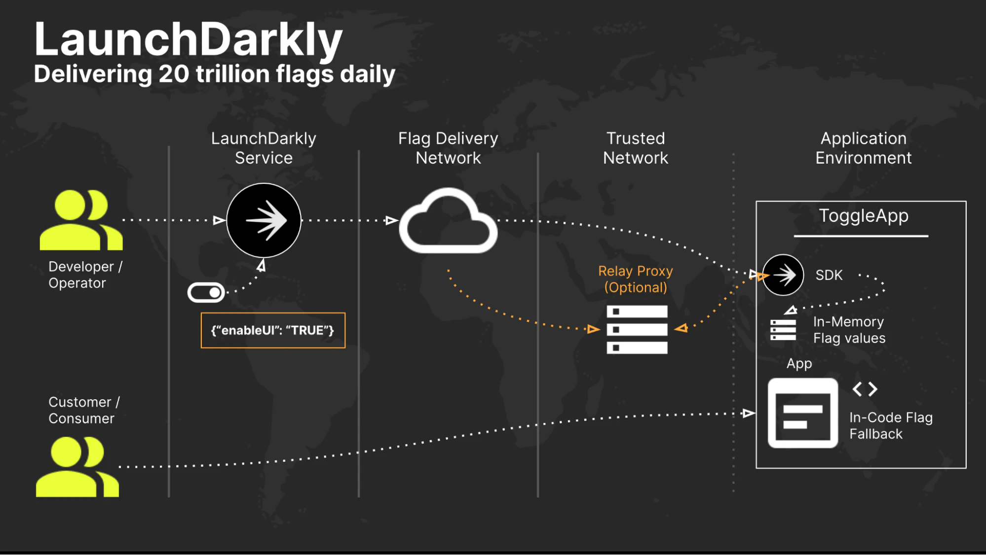 We’ve invested a lot in ensuring we have the fastest and most resilient Flag Delivery Network possible. That resilience is provided at multiple different layers: the LaunchDarkly core environment as the single source of truth, the CDN’s that cache that data, components like the relay proxy which allow users to cache locally within their own environment, and all the way down to the local default flag values in the user code.