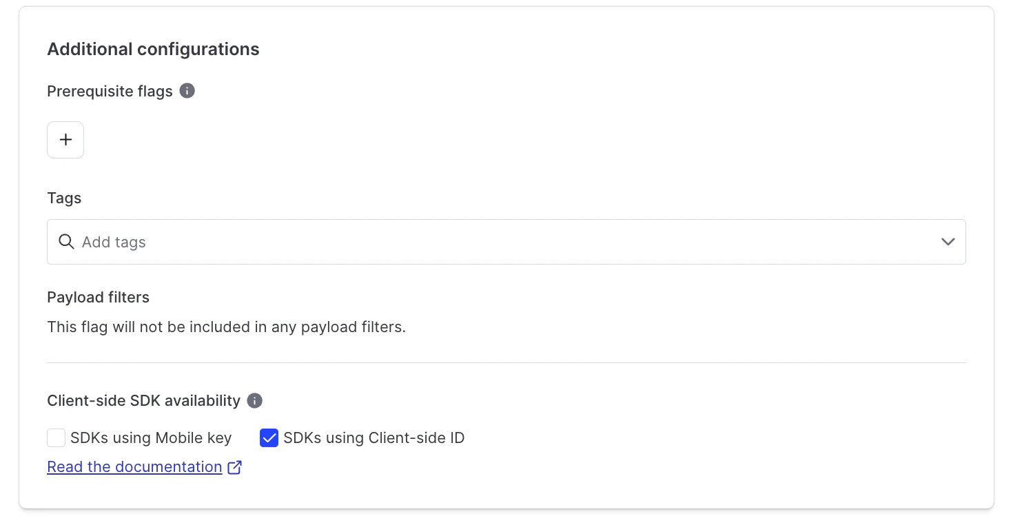 Set the flag type to Release Flag and Boolean, and check the client-side SDK checkmark. When complete, your feature flag setup should look like the below.