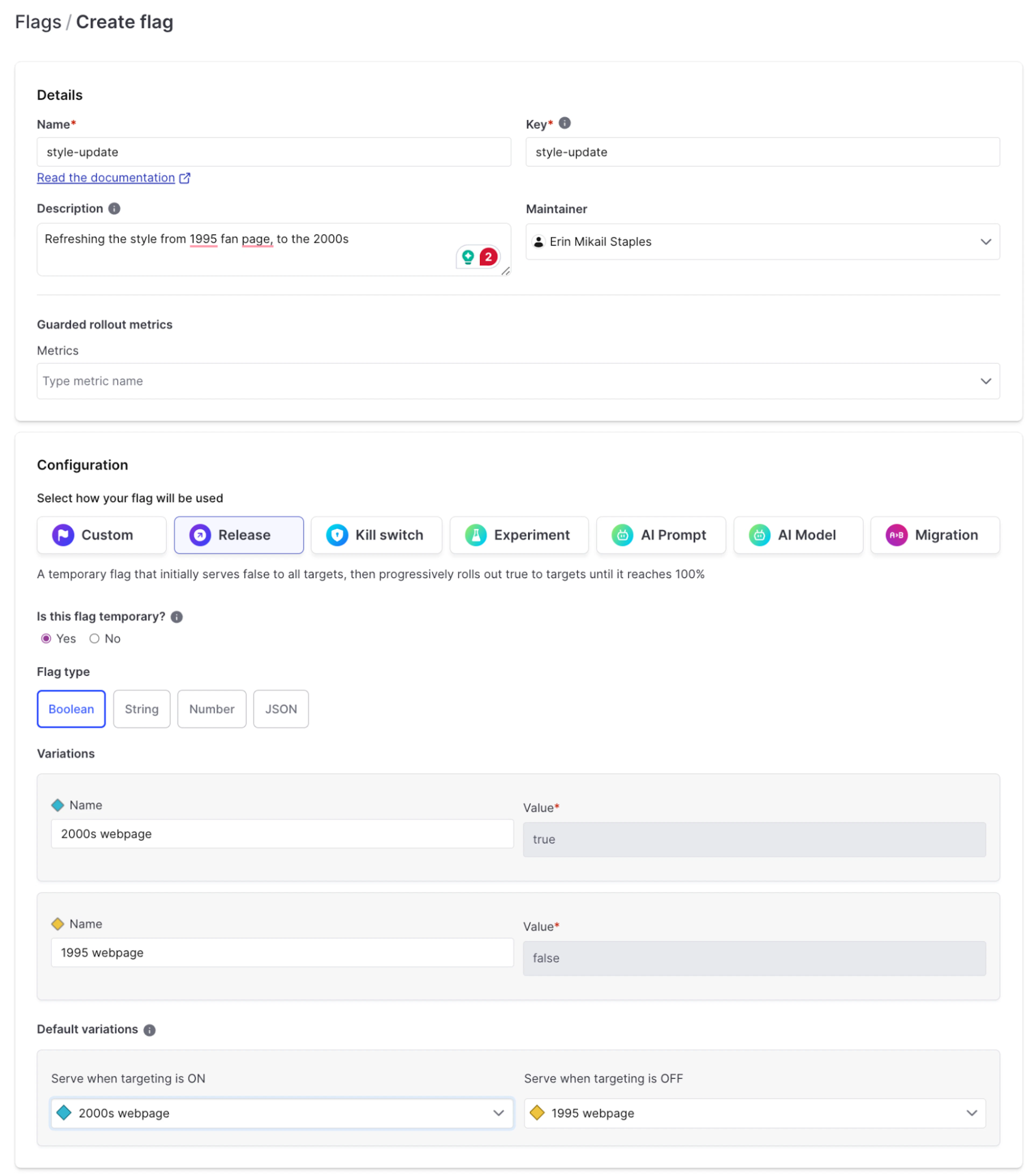 In your new project, create a feature flag named style-update. This flag will control whether your website displays the styling of the original 1995-styled or the new-and-improved 2000s-styled webpage.