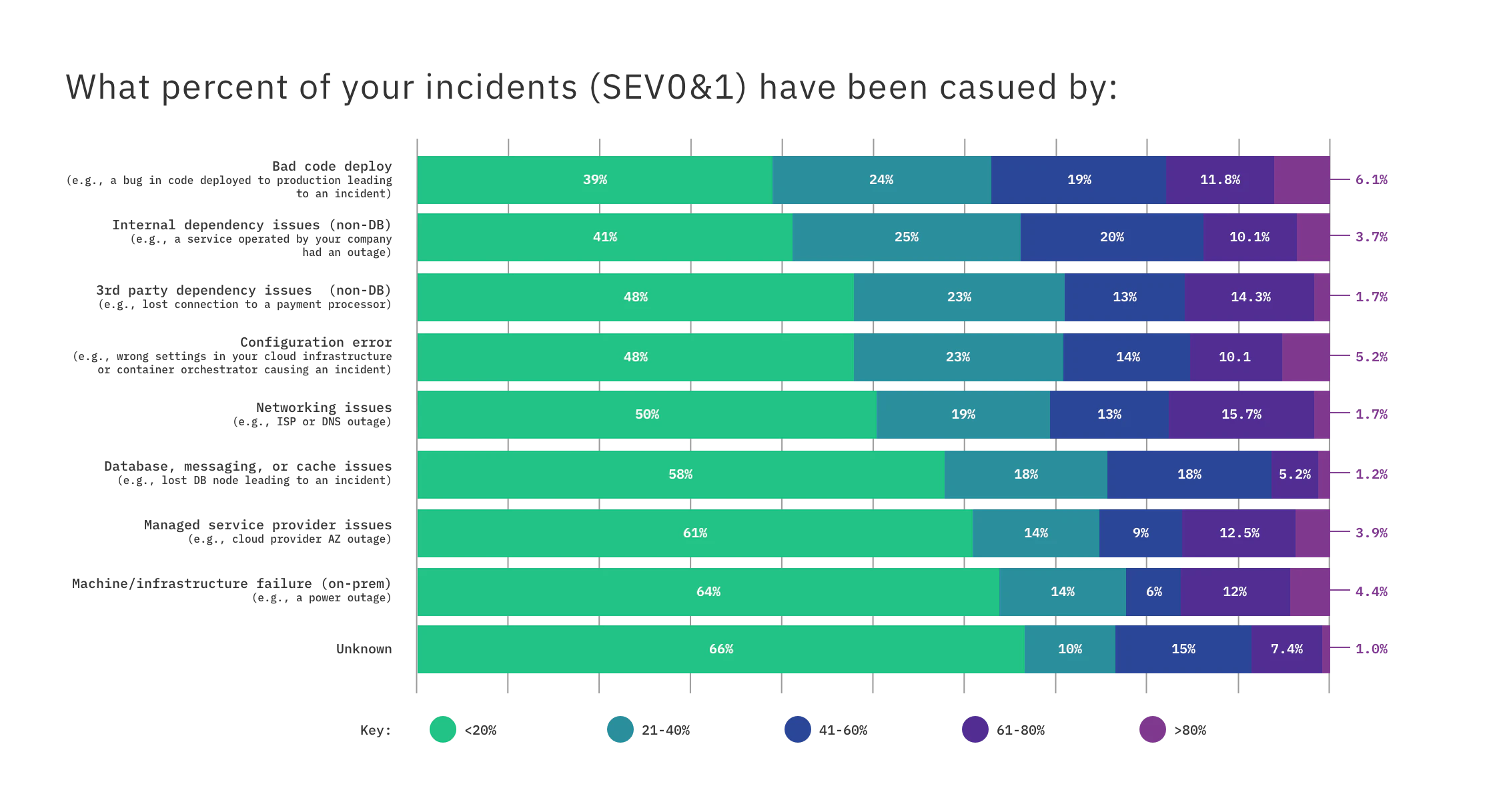 Factors causing SEV0&1 incidents including bad code deploys and dependency issues. All charts courtesy of Gremlin’s 2021 State of Chaos Engineering Report.