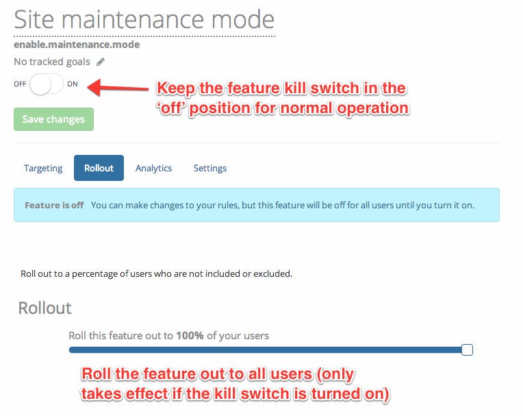 For per-user feature maintenance, you will still want to build the feature flag checks into your application as with whole-feature maintenance, but you will need to set up the feature a little differently in LaunchDarkly (or build a more complex system for deciding if a user is in maintenance mode or not, if you are building your own system). For LaunchDarkly in this case, we want the default rollout to be 0%, since we will be explicitly adding users.
