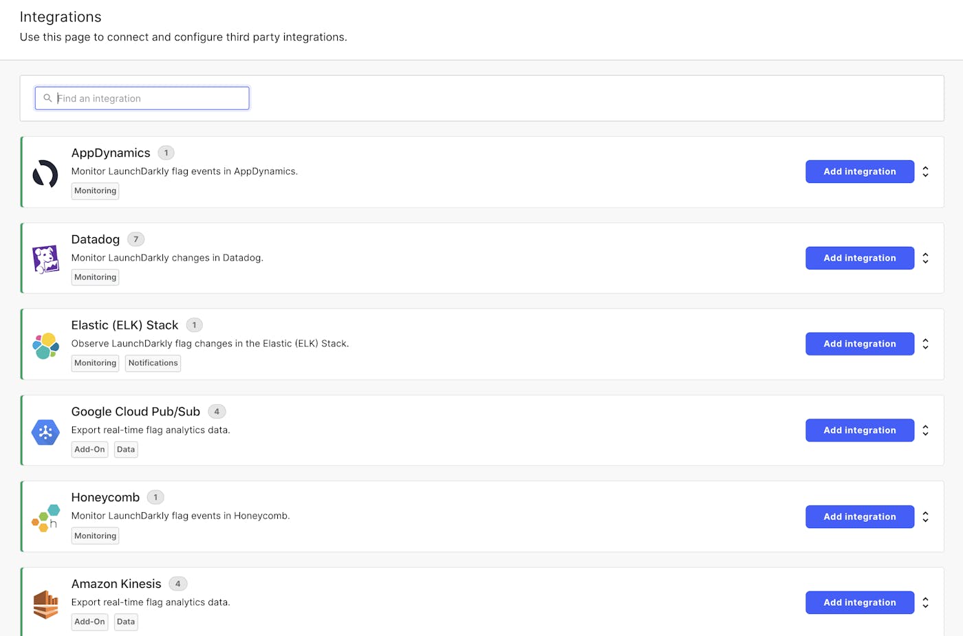: each third party we integrate with has a unique integration key. (This can, however, can include multiple integrations; for example, we offer both flag triggers and audit log events for Datadog.)