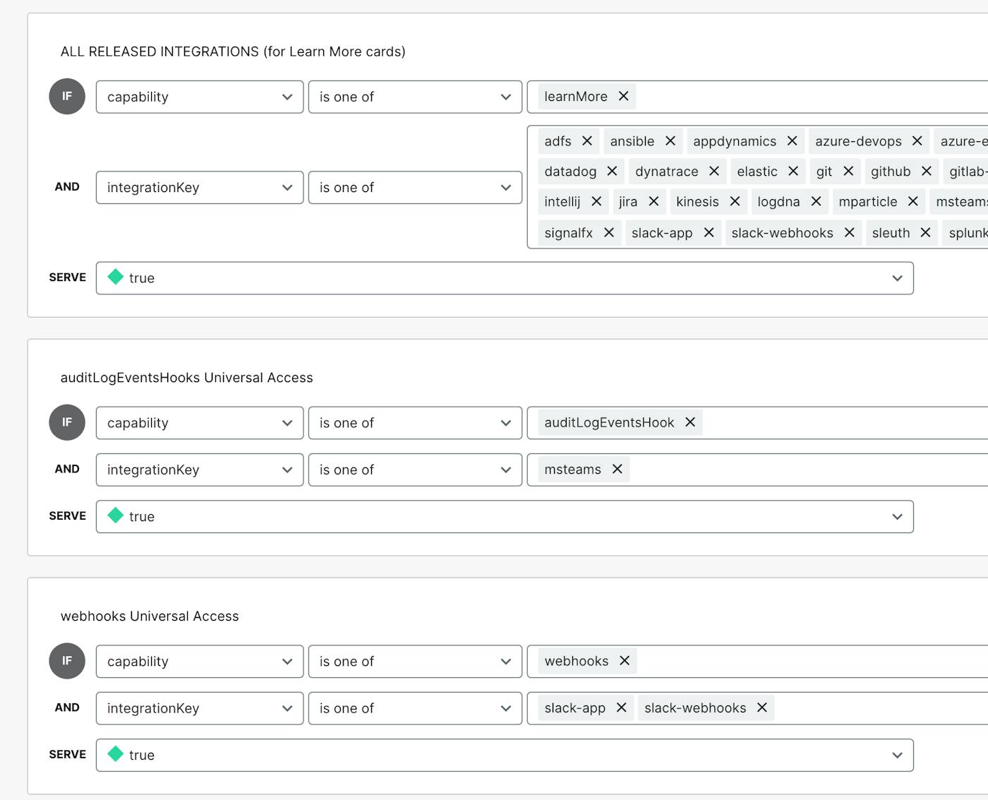 - The flag could only make use of data already available on our integration configuration objects (“manifests”) to minimize change and ensure easy extensibility. The integrations themselves would effectively act as our "user" entities for flag evaluation.