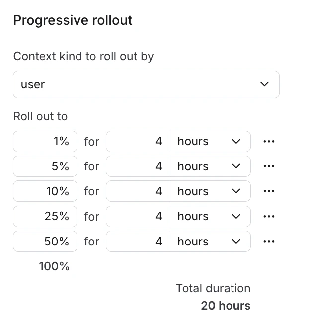 Let’s say you’re on an engineering team that’s launching a new checkout workflow for an ecommerce site. With Progressive Rollouts, you can easily update the flag targeting rule to define a rollout schedule that incrementally increases user exposure over (for example) 20 hours. You can start by introducing the new flag variation to just 1% of your users (or as few as .01%), as well as the time you want the flag variation to be served to that percentage of users. You can also set additional percentage and time increments, so your rollout schedule could look something like: