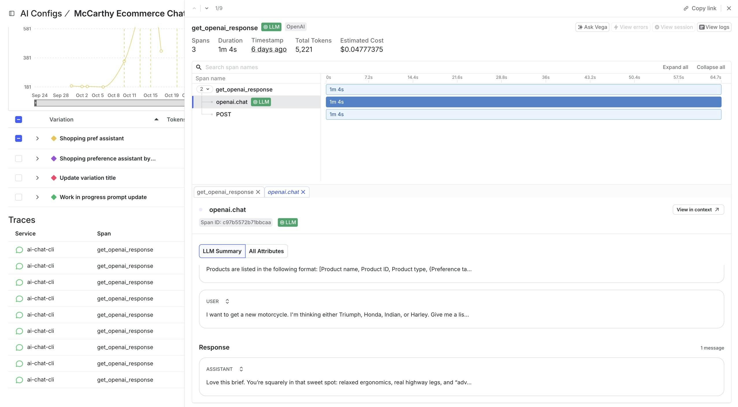 For example, an e-commerce team might reroute requests from one model provider to another to reduce cost, only to see a spike in spending despite healthy infrastructure metrics. Observability within AI Configs helps pinpoint the cause, revealing, for instance, a prompt change that increased token usage.