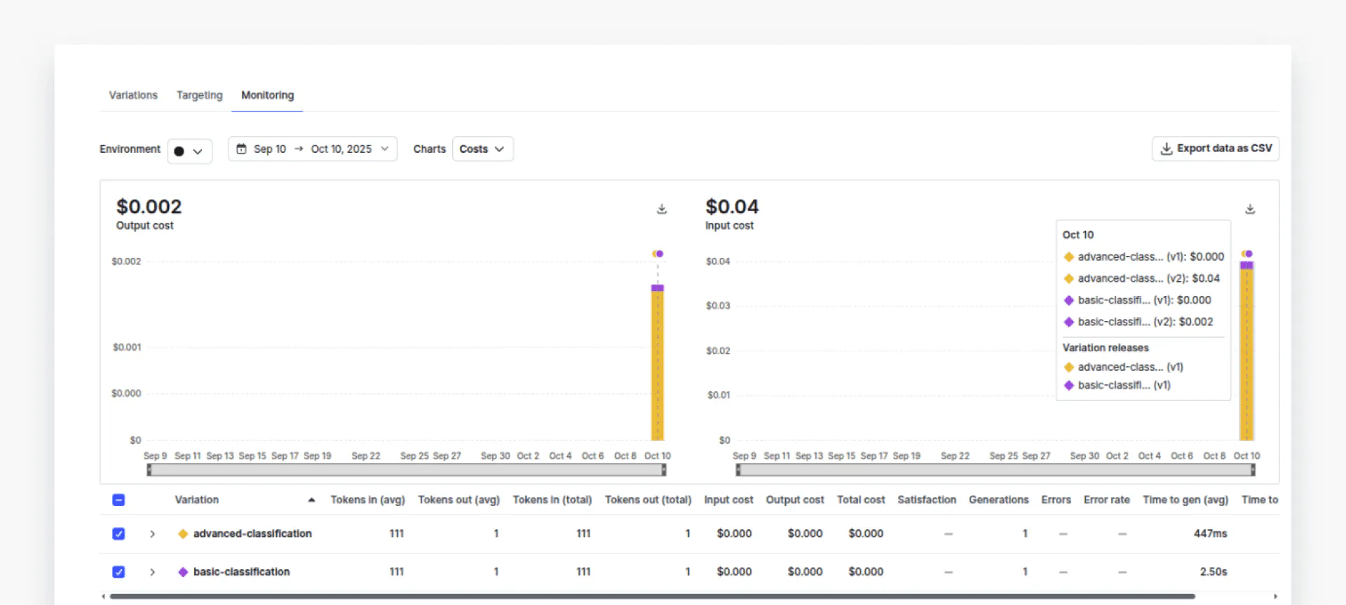 Now, if you go to the “Monitoring” tab in your AI Configs dashboard, you should see the data associated with two variations. Click “Costs” from the dropdown list to view the costs for both variations.