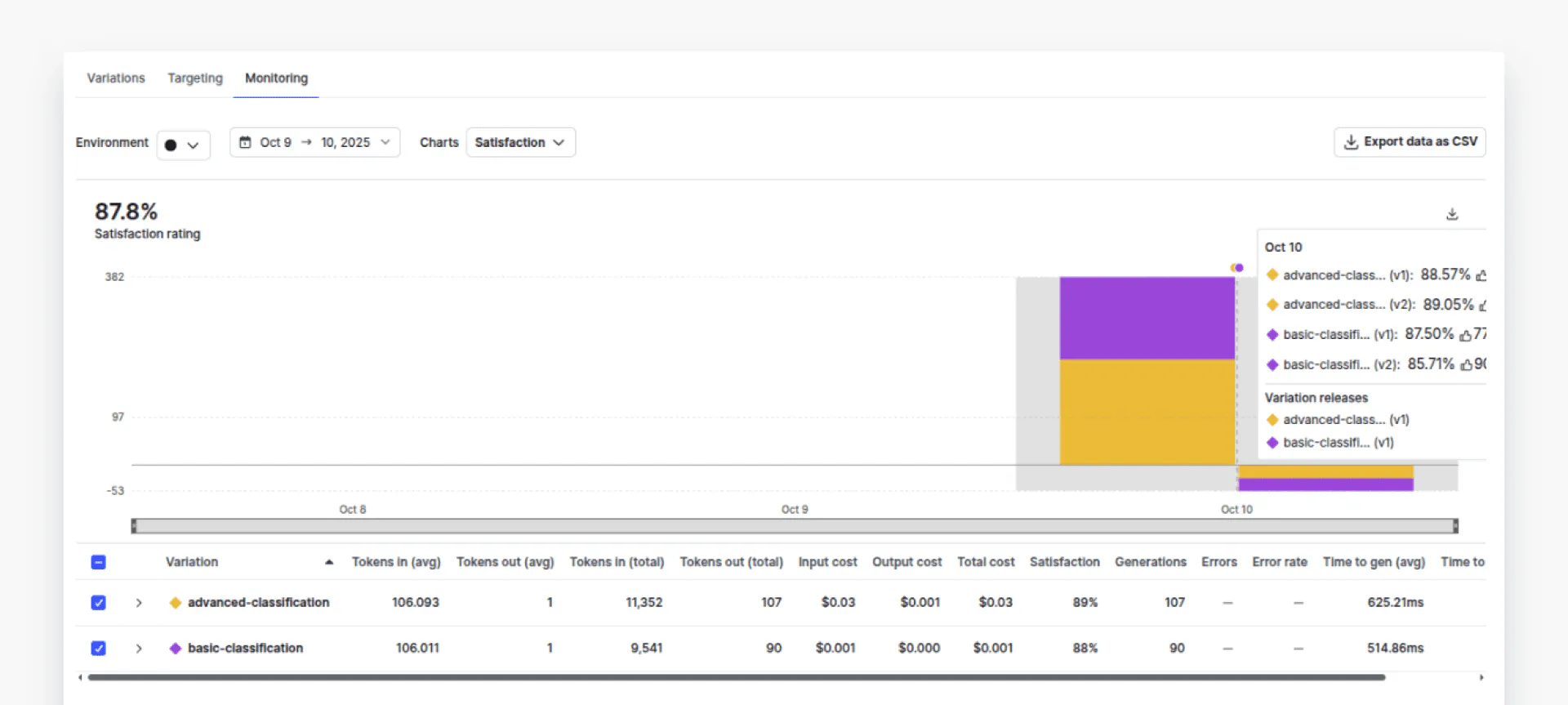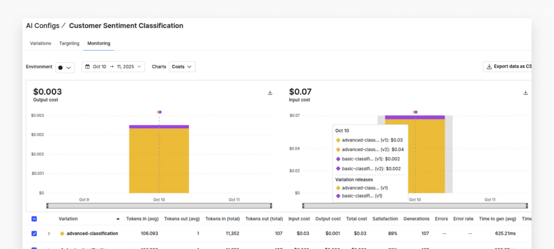 Now, if you go to the “Monitoring” tab in your AI Configs dashboard, you should see the data associated with two variations. Click “Costs” from the dropdown list to view the costs for both variations.