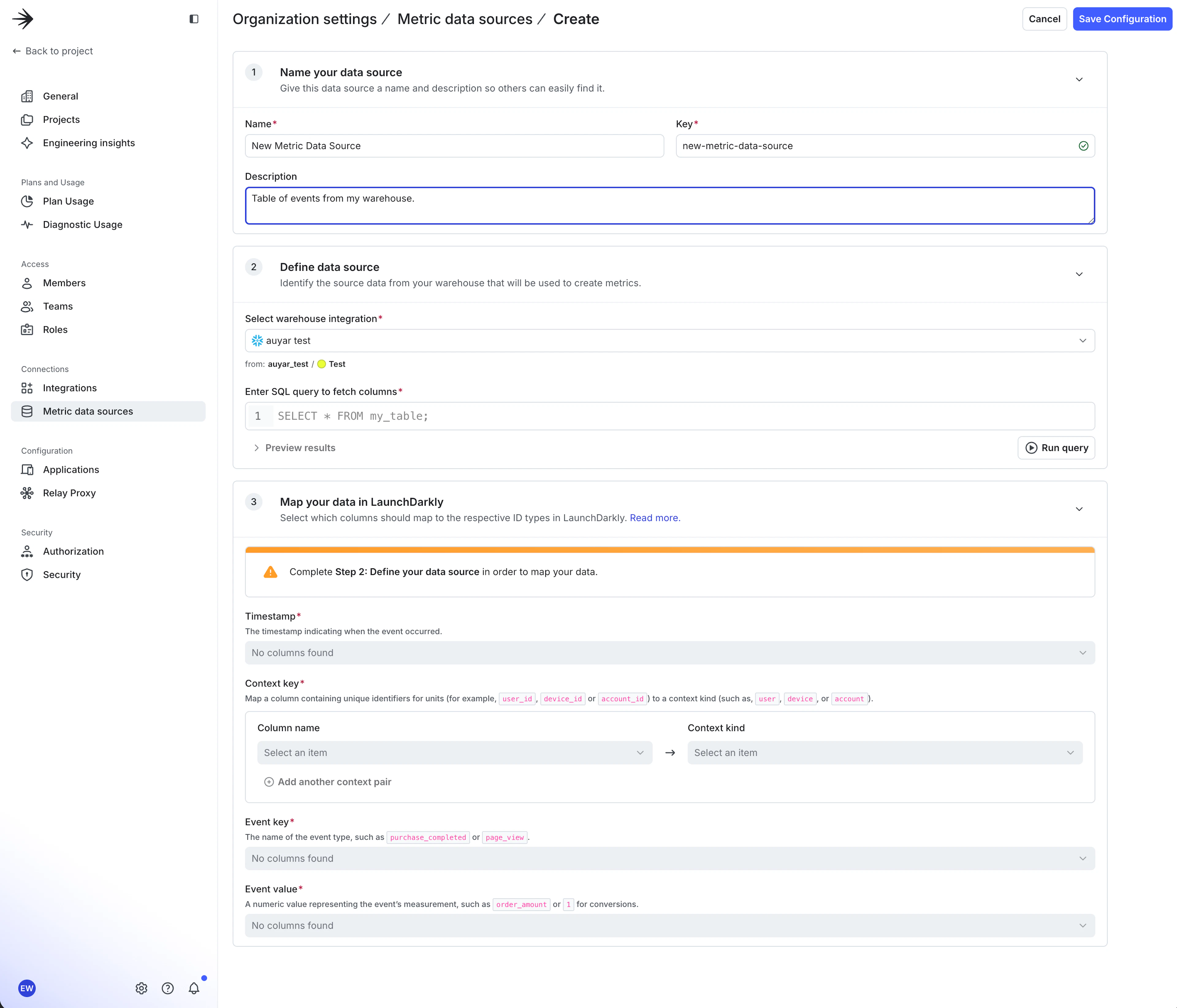 To get started with metric data sources, first complete your Snowflake Native Experimentation integration. Then, navigate to your organization settings, and click Metric data sources in the sidebar.