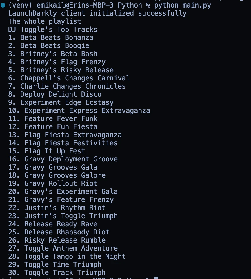 - Finally, the application will print out a list of tracks, either from the database or the JSON file depending on the evaluation of the feature flag. The application is then set to run if the script is directly executed and the LaunchDarkly client is closed to free up any remaining resources.
