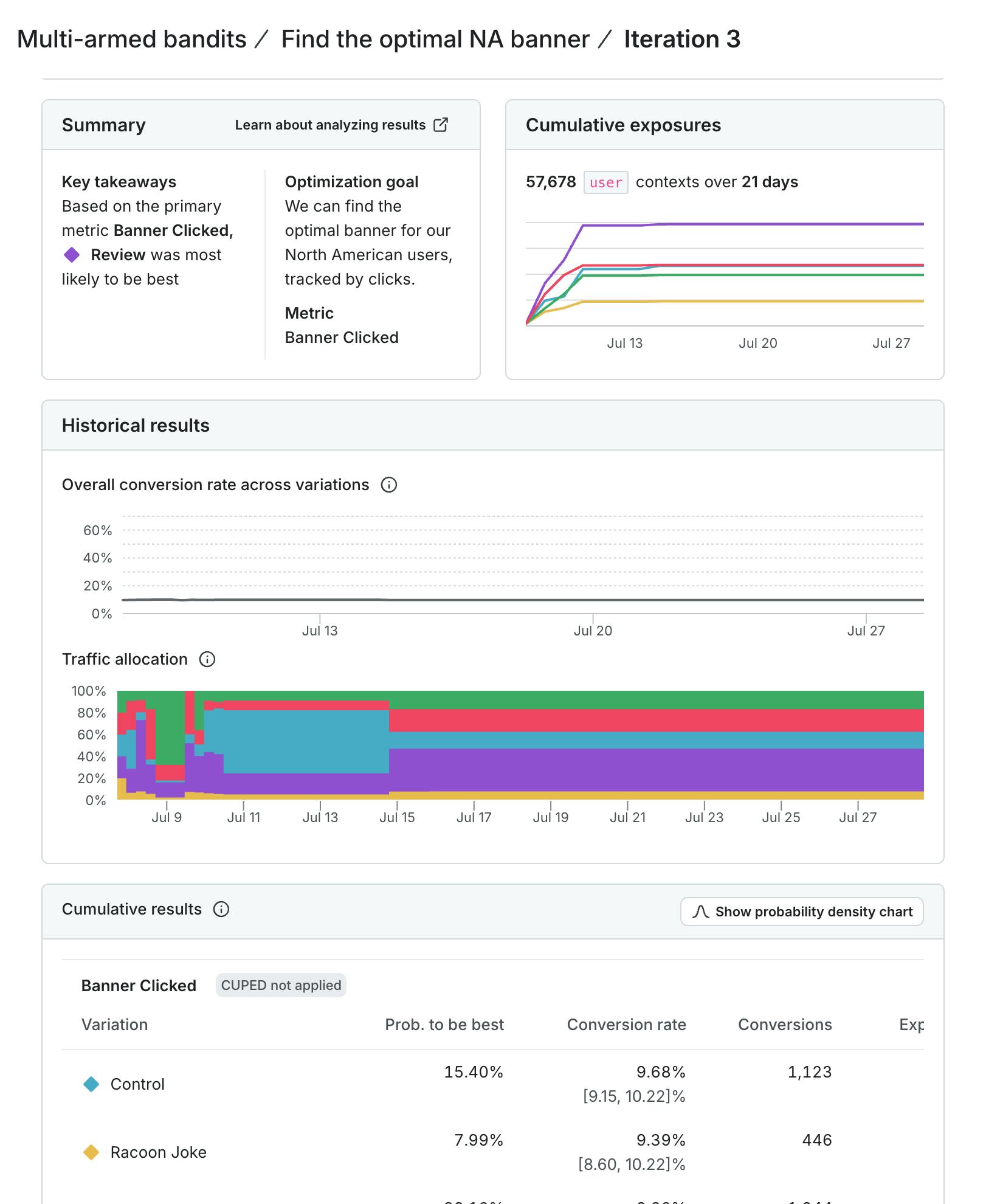 These screenshots show the difference in user behavior and how the traffic allocation shifted differently across the different tests. Even in my example using simulated data, the results change to serve the winning variation more often over time. Yet I can still explore the other options to ensure that, as user behavior shifts as time progresses, our experiment will shift too. In North America, for example, we got some early evidence that our control was performing well. However, user behaviors change as time passes, and our model picks up on that and shifts traffic accordingly. This ensures that we’re taking advantage of our early learnings, while still exploring the space to learn more.