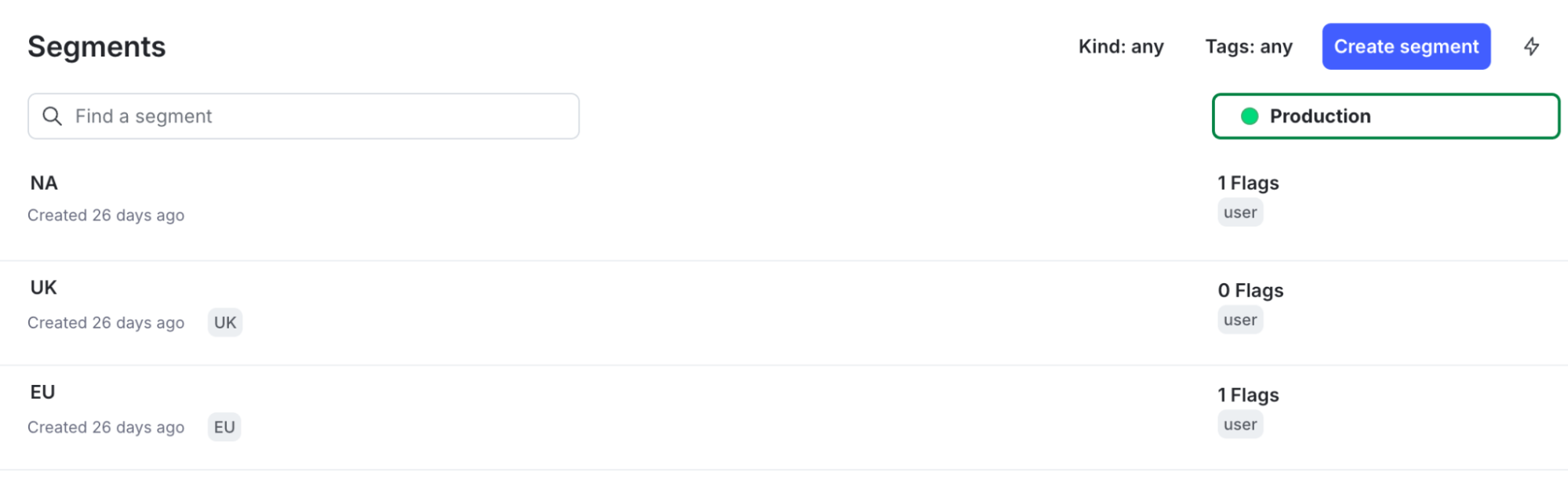 I’ve got a few segments set up representing North America, the UK, and the EU. It simply looks at the country attribute passed into my context. In this example, I've created three segments representing the three regions I want to target with my MAB. In this case, it's a simple attribute filter looking at the user’s country.