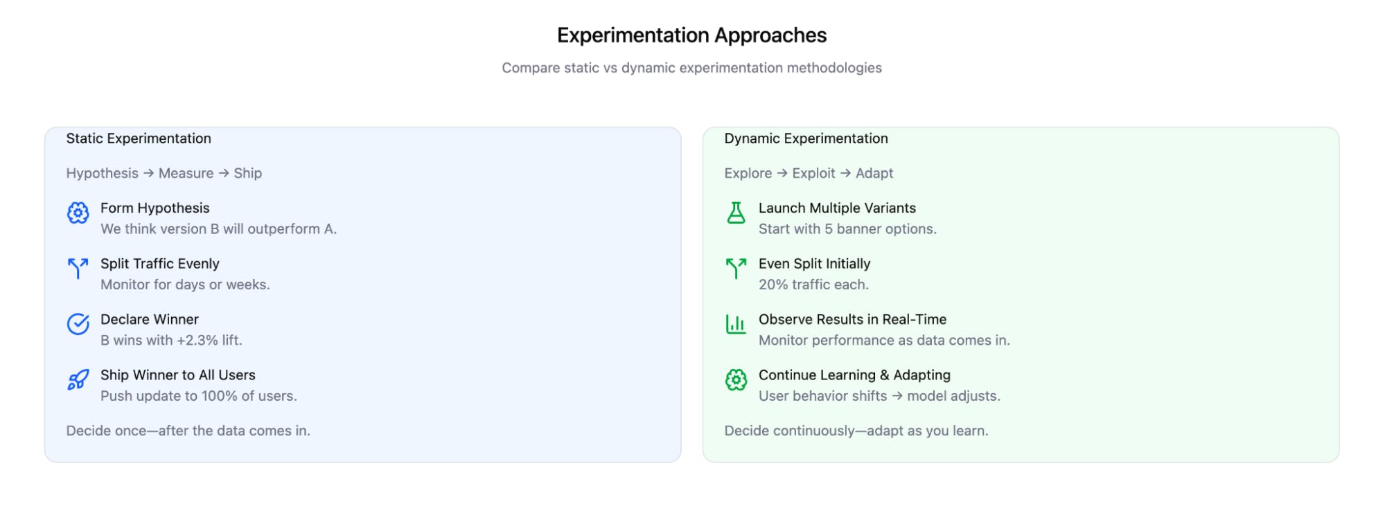 Looking back with perfect hindsight, if we’d served the winning variation to all 100,000 users from the start, we’d have achieved 5× the impact; a 2% lift across the entire population, not just a fifth of it.