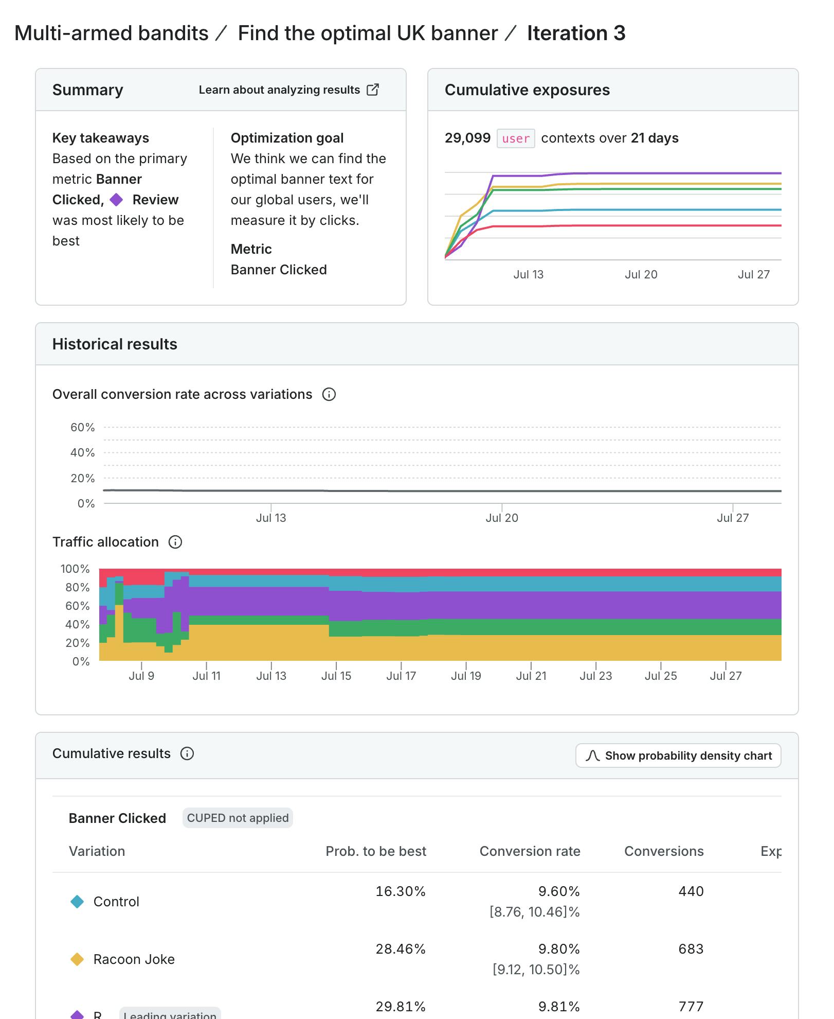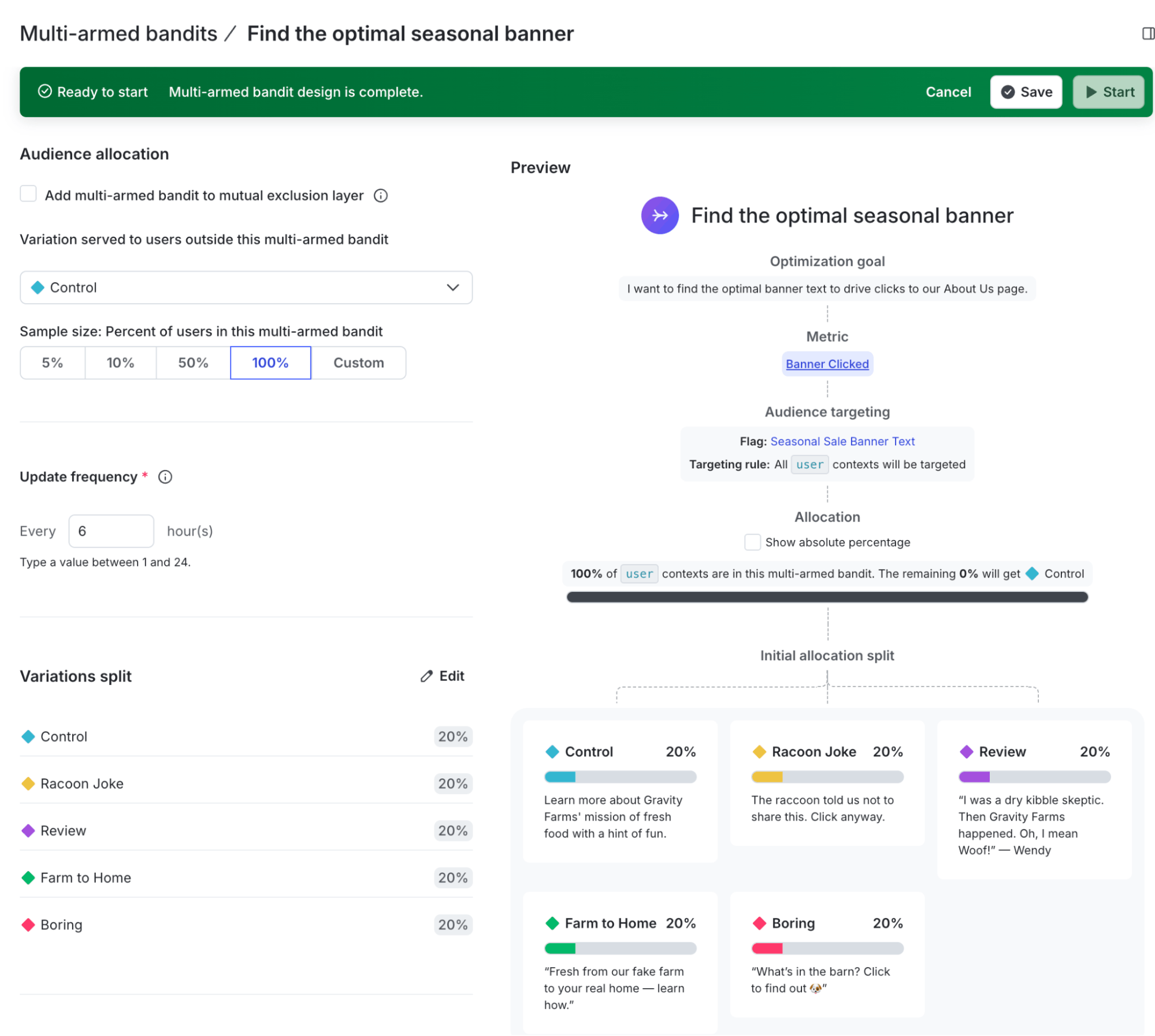 After this is set up, we’re off to the races!  Our Multi-Armed Bandit will start with even splits, but every 6 hours (in the example above), the data we’ve received will help us shift our allocations towards the one that’s winning more often.