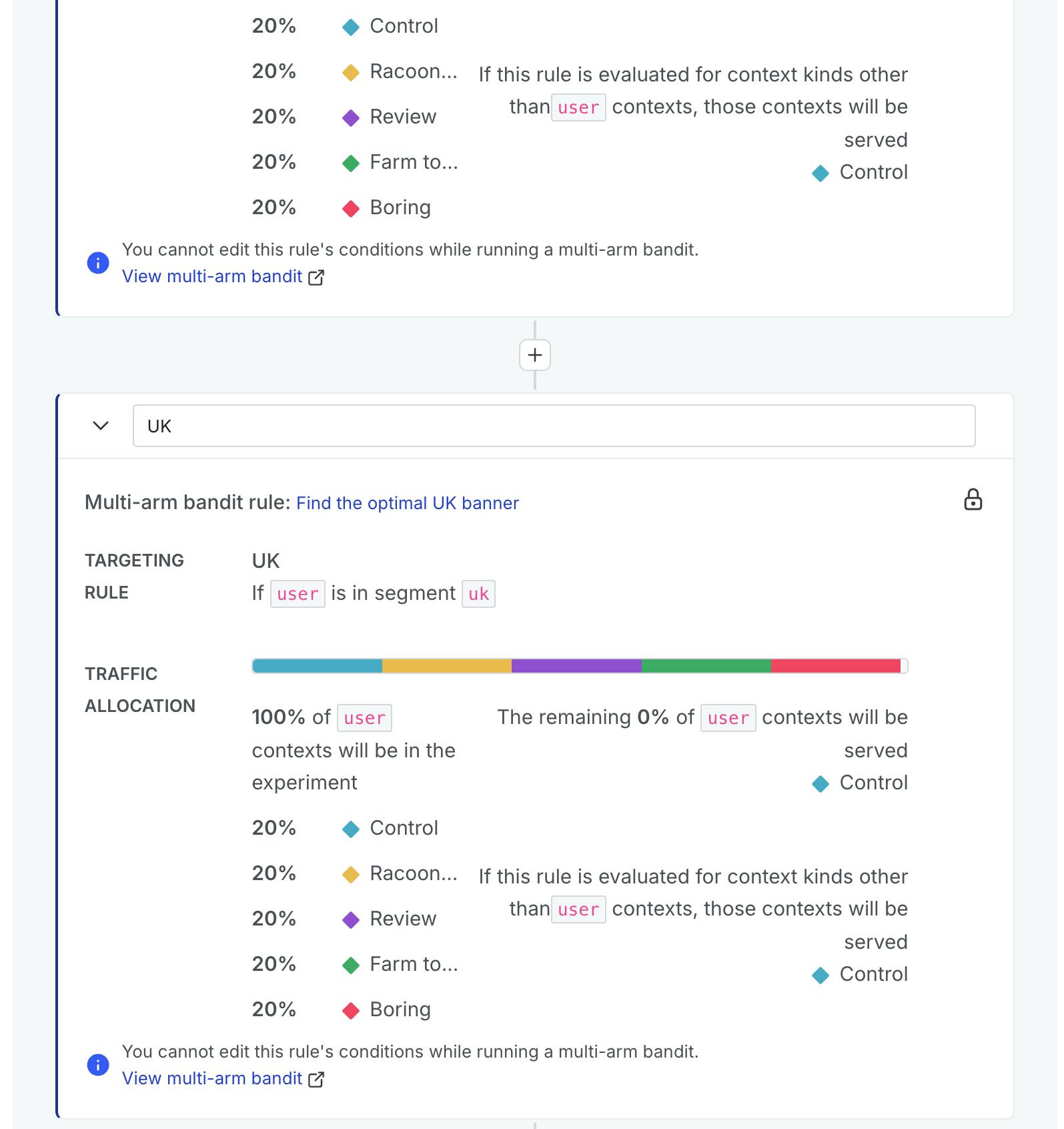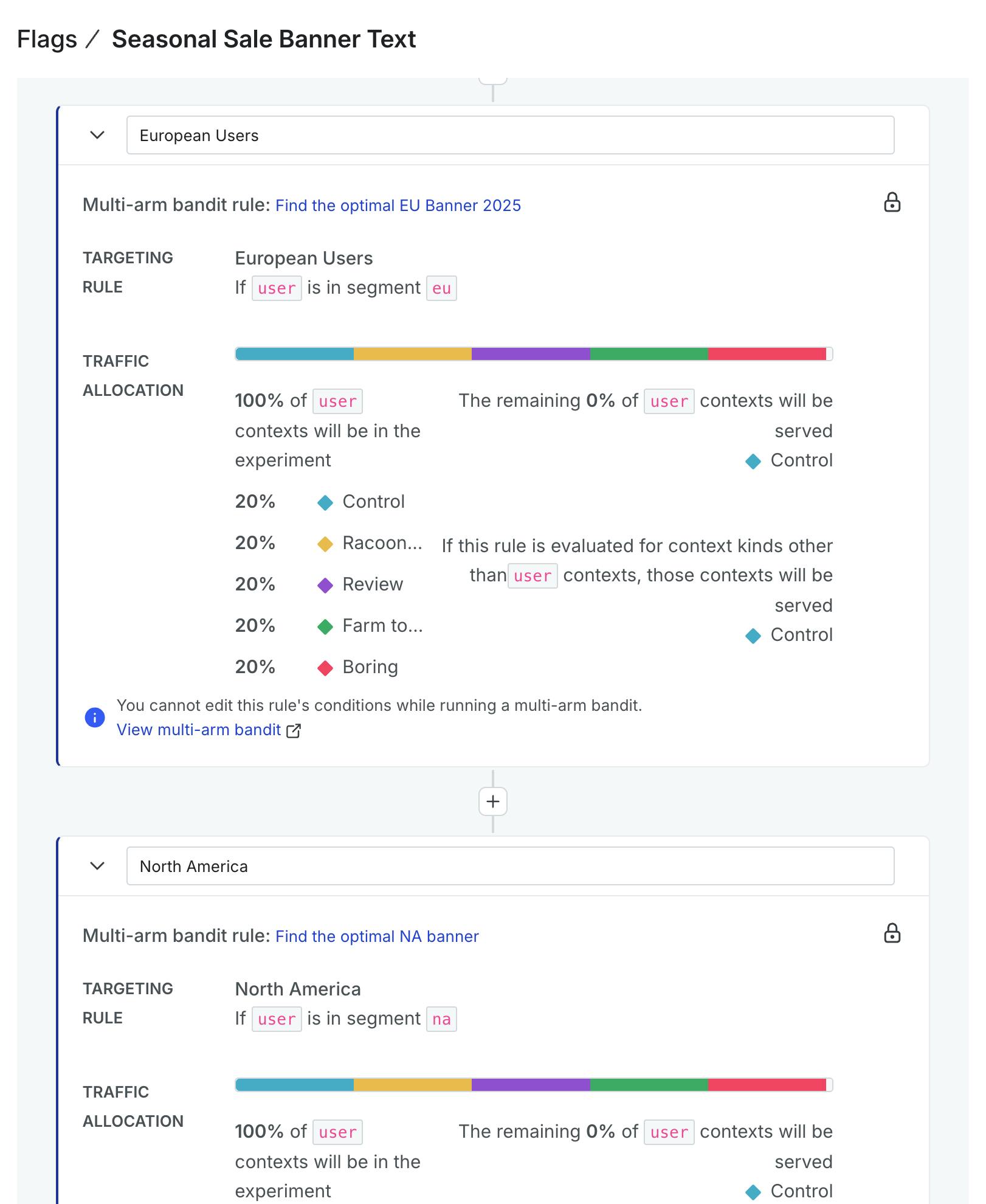 I’ve created my 3 MABs and attached them to the flag rules. If I navigate to my Flag screen in LaunchDarkly and select my banner text flag, I should see multi-armed bandits for each of my 3 targeting rules.