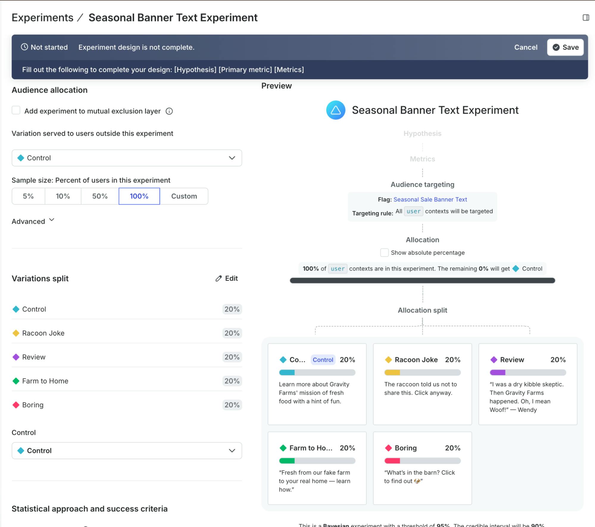 If I wanted to learn which text would drive the most clicks on the banner, I could simply set up an experiment in LaunchDarkly. I guess that would be an A/B/C/D/E test.