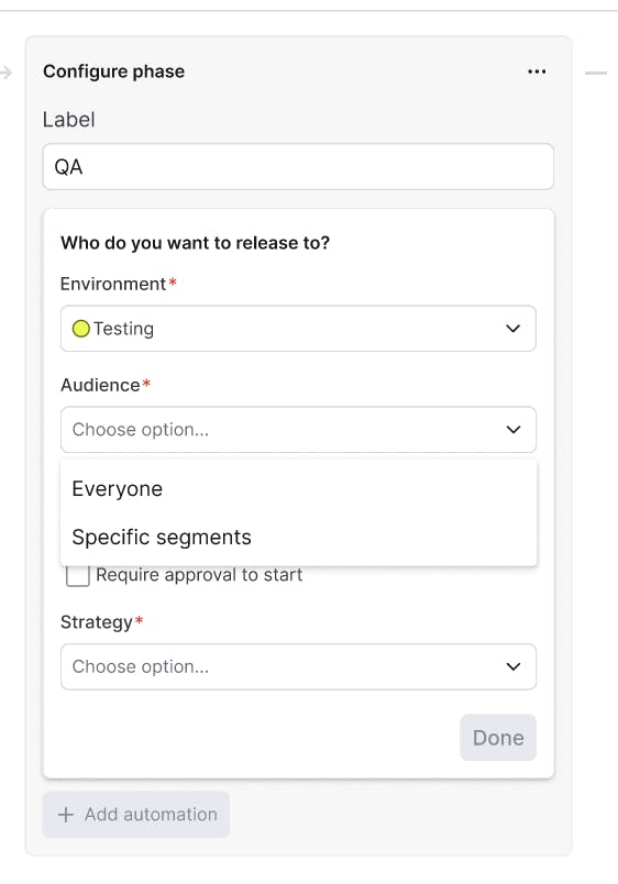Choose how to automate the rollout to an audience in a phase: by releasing immediately, or, by monitoring the impact of the release for a given audience and environment using Release Guardian.