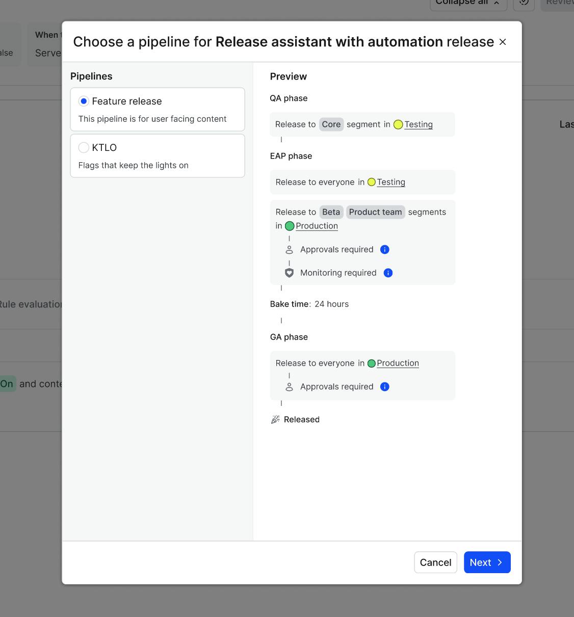 Release Assistant is GA for Enterprise plans. To get started, refer to our documentation and get started by creating a release pipeline in LaunchDarkly.