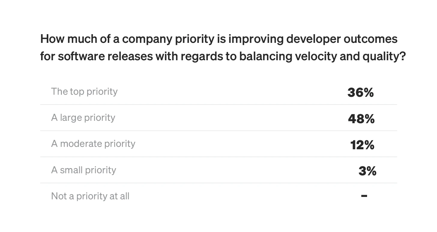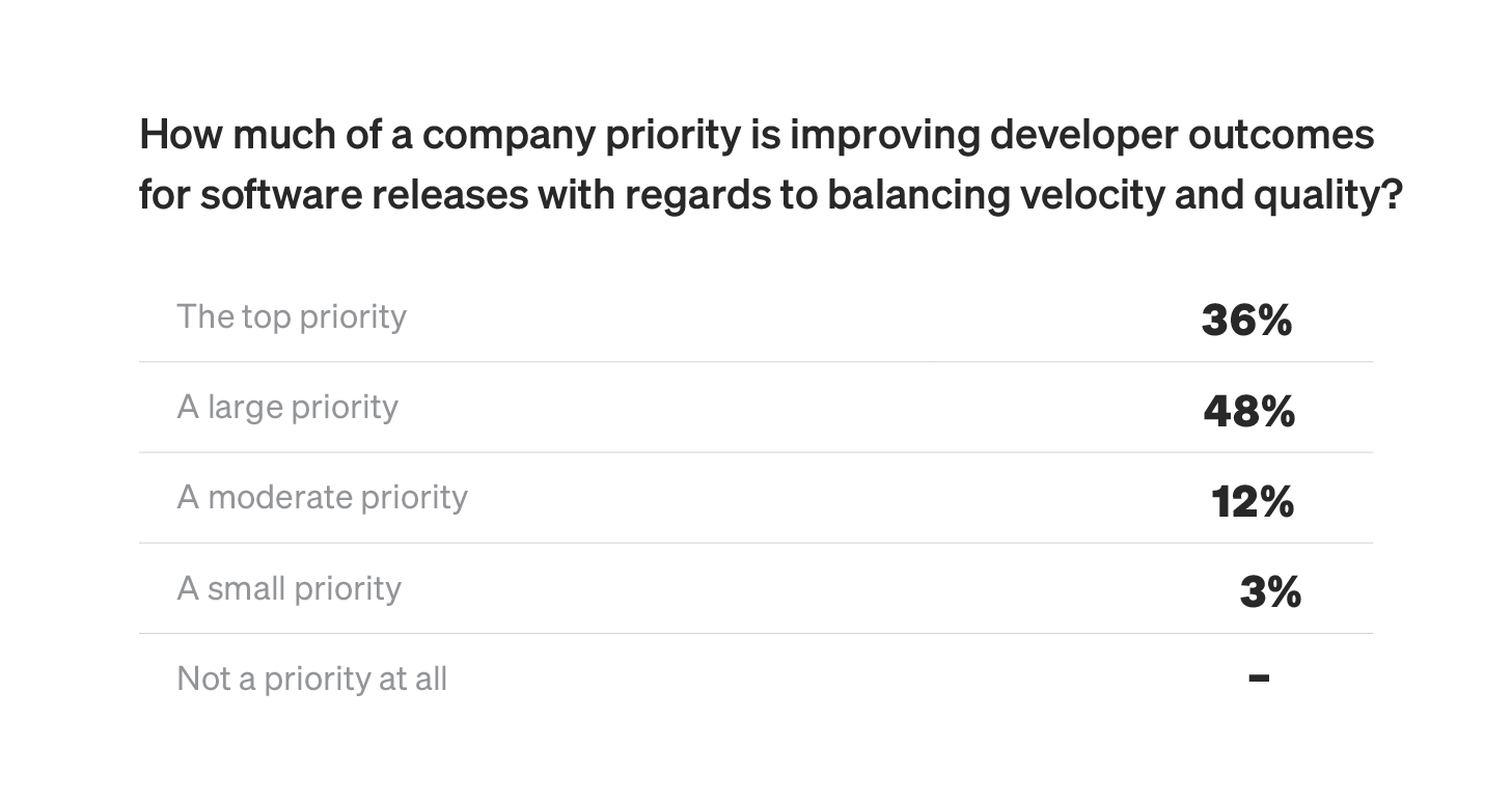 If devs feel supported by their companies, management is more likely to see tangible results. As we found in the report, when leadership places the improvement of developer outcomes as either a top or large priority, 67% of developers say there's a much stronger focus on releasing updates faster as opposed to avoiding rollbacks. So, basically, dev teams that feel like their companies are looking out for them are also releasing more frequently.