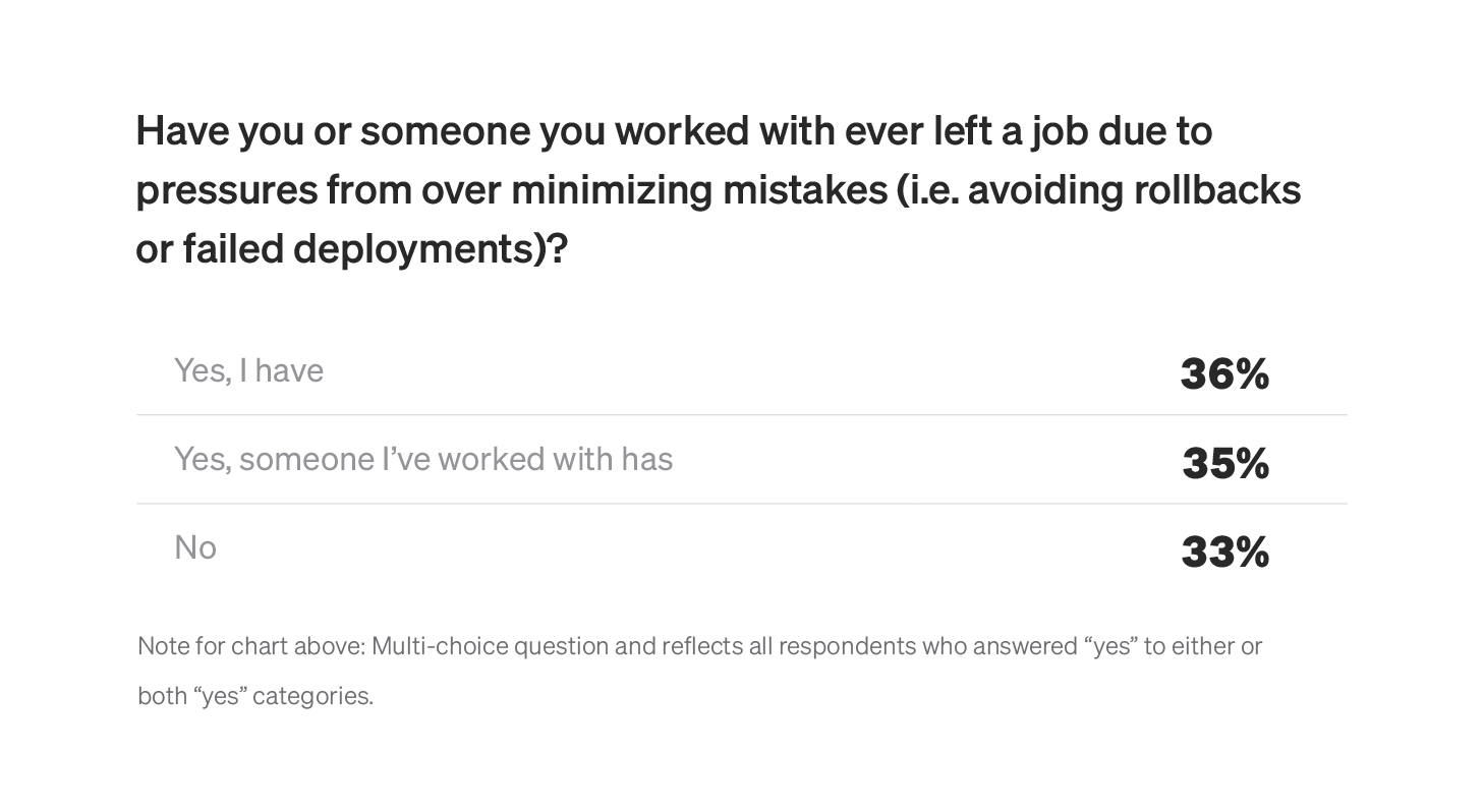 Sixty-seven percent of the developers we surveyed either have (or know someone who has) left a job due to an overemphasis on minimizing deployment errors. That goes back to the idea that if you're too cautious with software releases, it'll end up costing you.