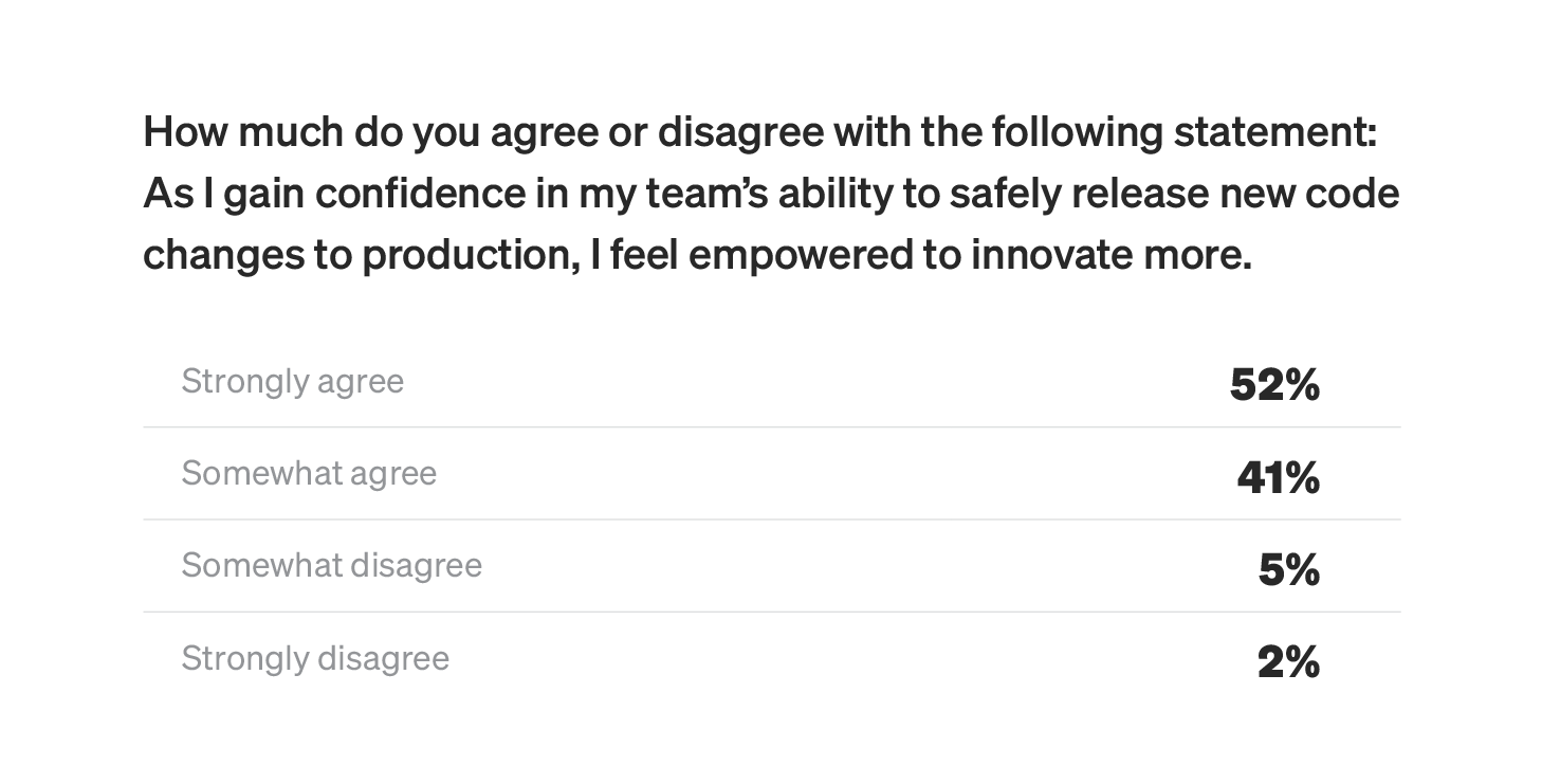 And business leaders can't just say they're trying to improve the performance of developers. Their efforts need to be observable. Virtually all of our respondents (99%) reported a desire to feel safe when taking risks in deployment, especially when it comes to internal buy-in, tools, and culture (94%).