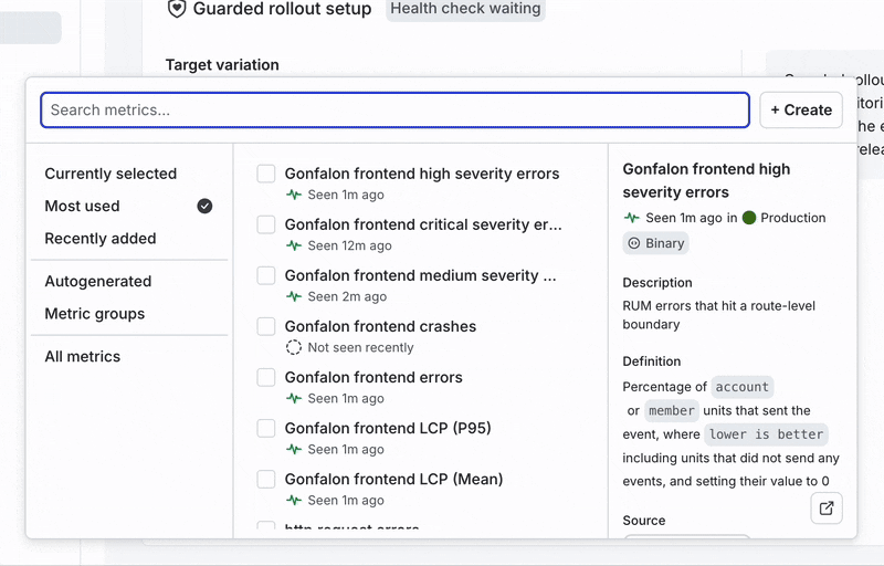 The old metric list was a wall of data showing counts of guarded releases and experiments, each using a metric. Combined with filters, sorts, and recency cues, the list is now more signal-rich; you’ll see counts for active experiment connections and guarded releases, which makes it easier to spot which metrics are in play at any moment. When teams know how and where metrics are used, they can better judge a metric’s reliability and relevance before applying it to releases and experiments.
