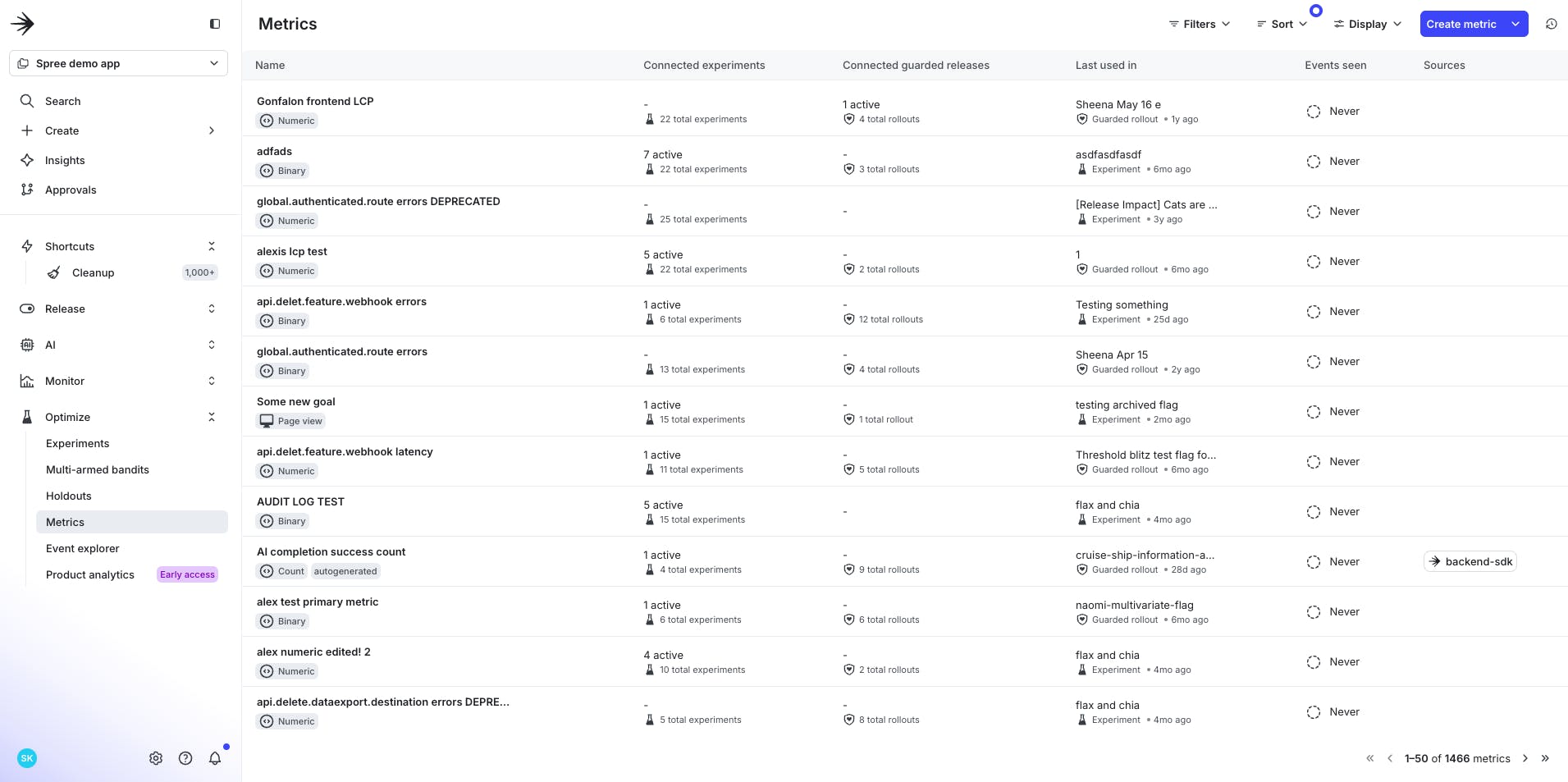 The old metric list was a wall of data showing counts of guarded releases and experiments, each using a metric. Combined with filters, sorts, and recency cues, the list is now more signal-rich; you’ll see counts for active experiment connections and guarded releases, which makes it easier to spot which metrics are in play at any moment. When teams know how and where metrics are used, they can better judge a metric’s reliability and relevance before applying it to releases and experiments.