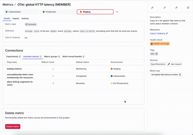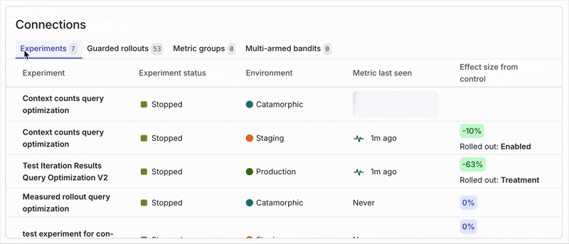 Guarded releases are quickly becoming the norm for releasing software, which means a single metric can be connected to hundreds of guarded releases over time. Our old connections table wouldn’t scale well in that scenario, so we’ve rebuilt it as a tabbed experience, organizing connections by Experiments, Guarded Releases, and Metric Groups. This new structure not only scales better; it also integrates neatly with the new Details tab for smoother navigation across related data.