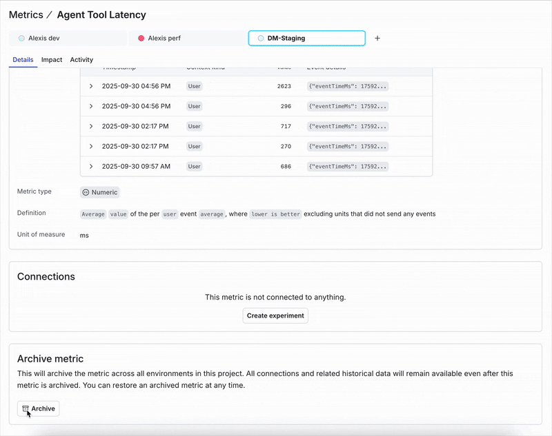 Previously, LaunchDarkly users landed on the Impact tab, which was great if the metric was part of an active experiment, but not as useful otherwise. We’ve since introduced a Details surface that shows you key information like configuration, definitions, and connections upfront along with a preview of the event data used to configure the metric. It’s a more consistent landing experience that makes better use of your time.
