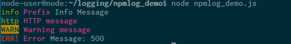 From the output, only levels from info to error are logged. Also, note that the output is colorized allowing you to differentiate the messages. However, since Npmlog doesn’t use the JSON format, it can be a huge drawback, especially when you want to sort or filter them.
