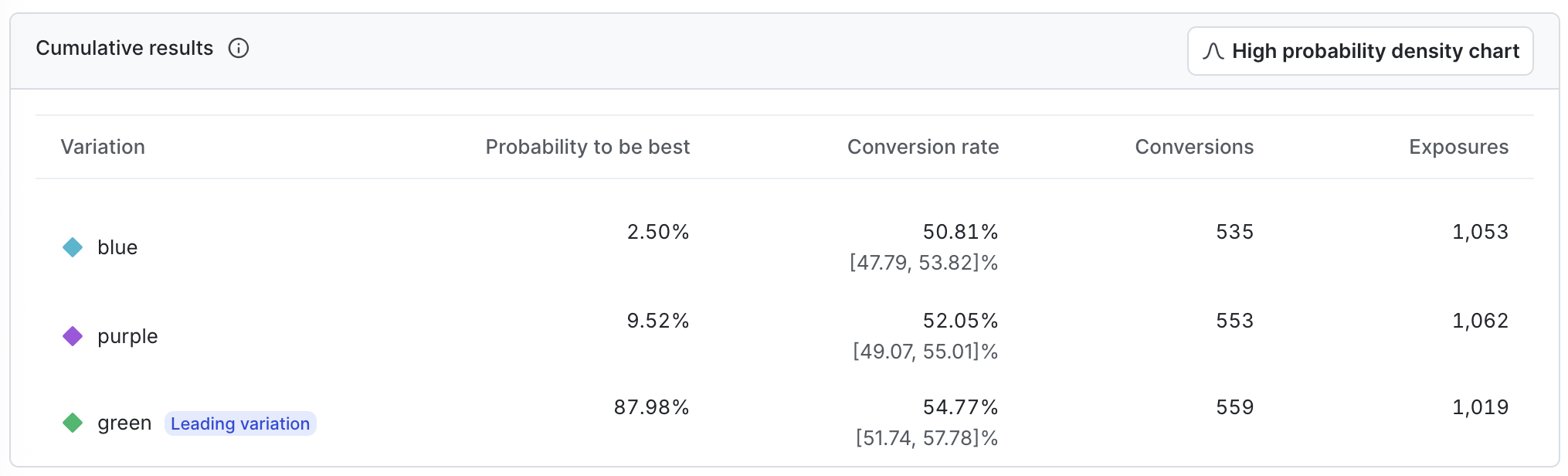 The “Cumulative results” chart displays the leading variation, and, depending on the metric type, columns with information about probability to be best, conversion rate, conversions, mean, and exposures.