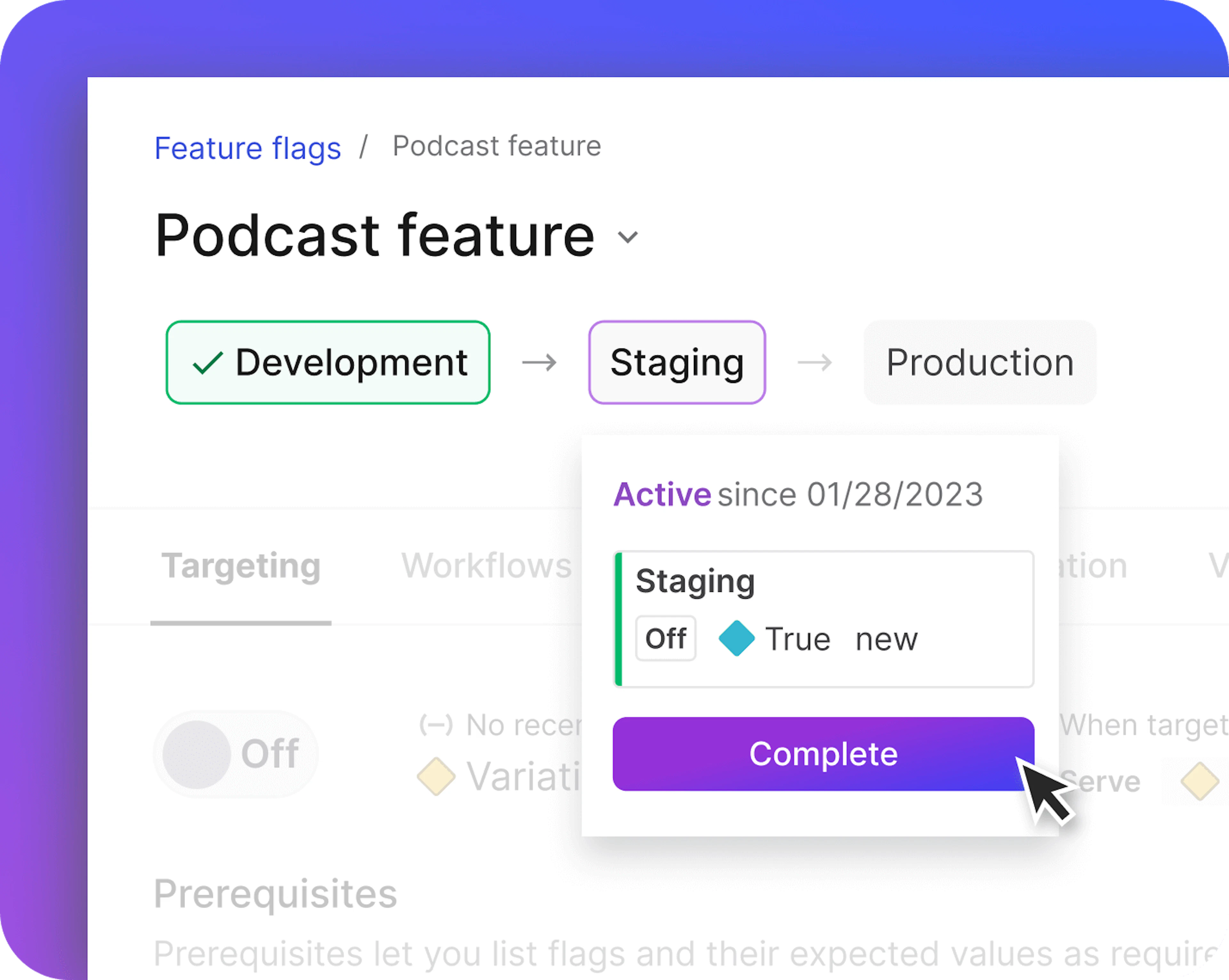 With Release Assistant, design release pipelines in which new features progress through an ordered set of environments—from local development to production—and follow targeting rules for each audience.