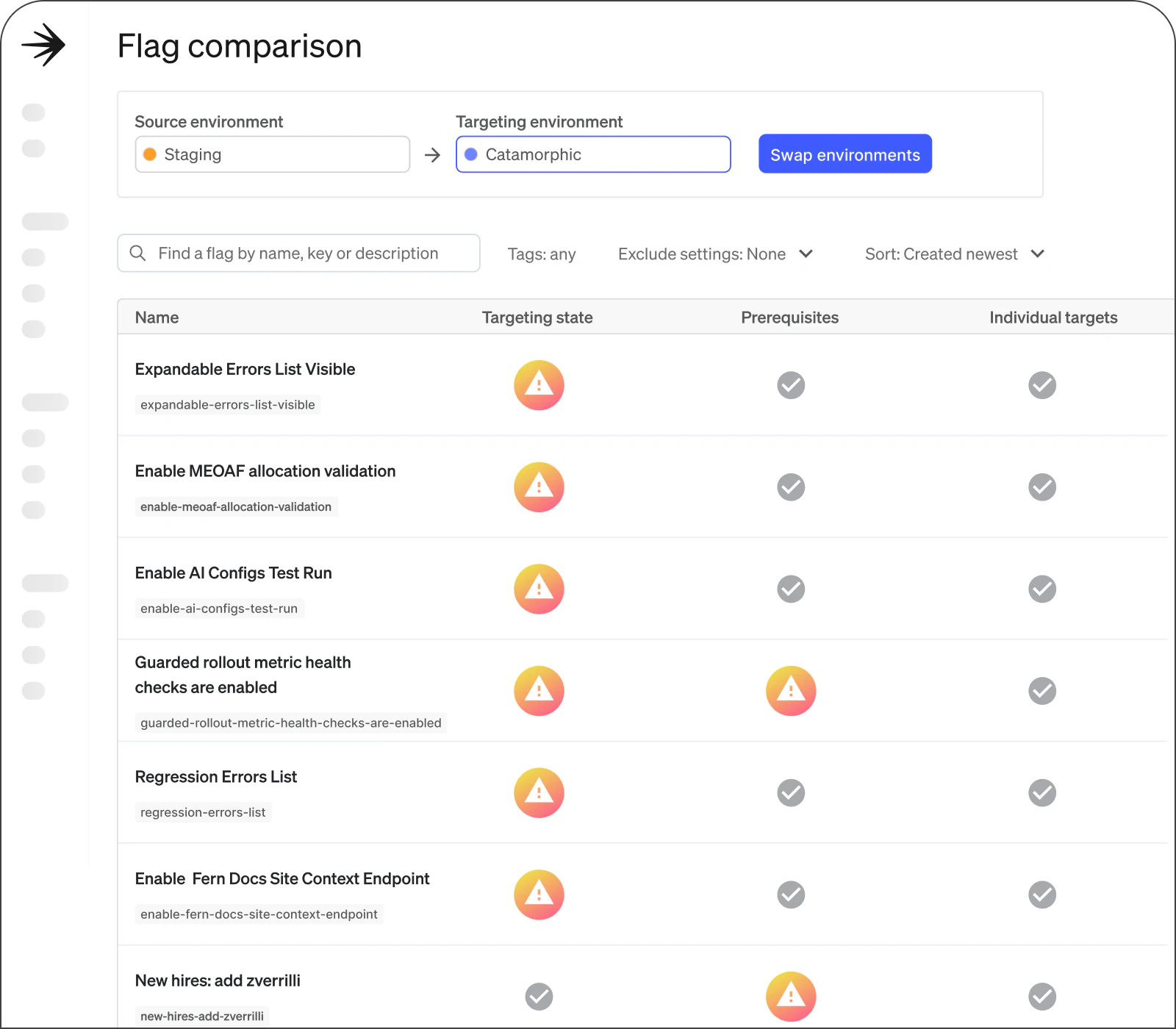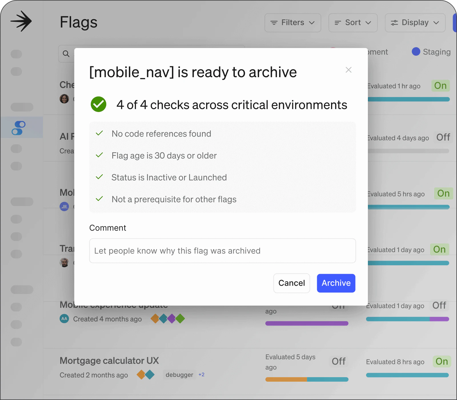 See who created a flag, when a flag was last referenced, whether a flag is still active, and more. Feel confident in determining whether to keep, remove, or modify a flag.