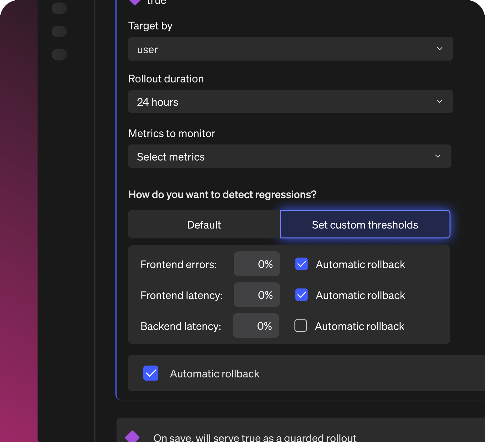 Set custom performance thresholds and trigger rollbacks instantly — no manual intervention required.
