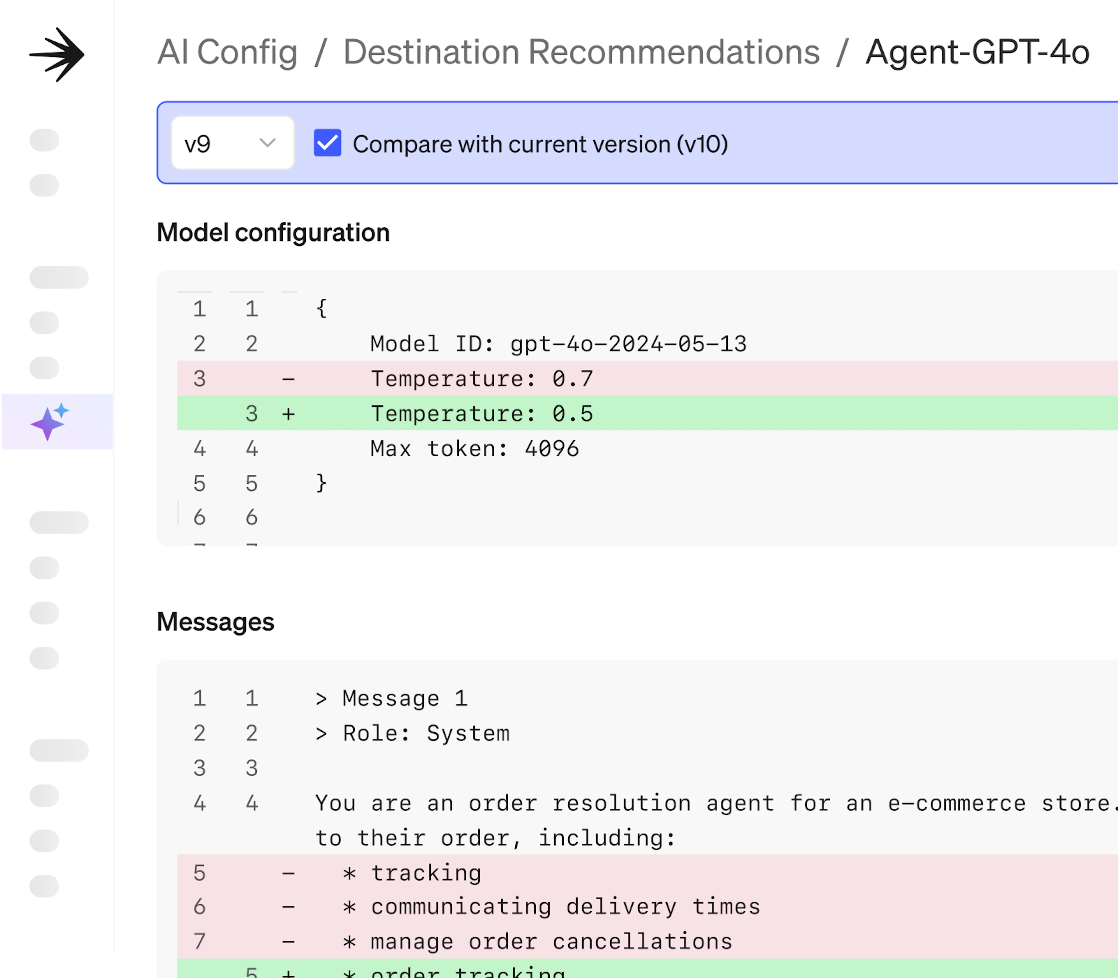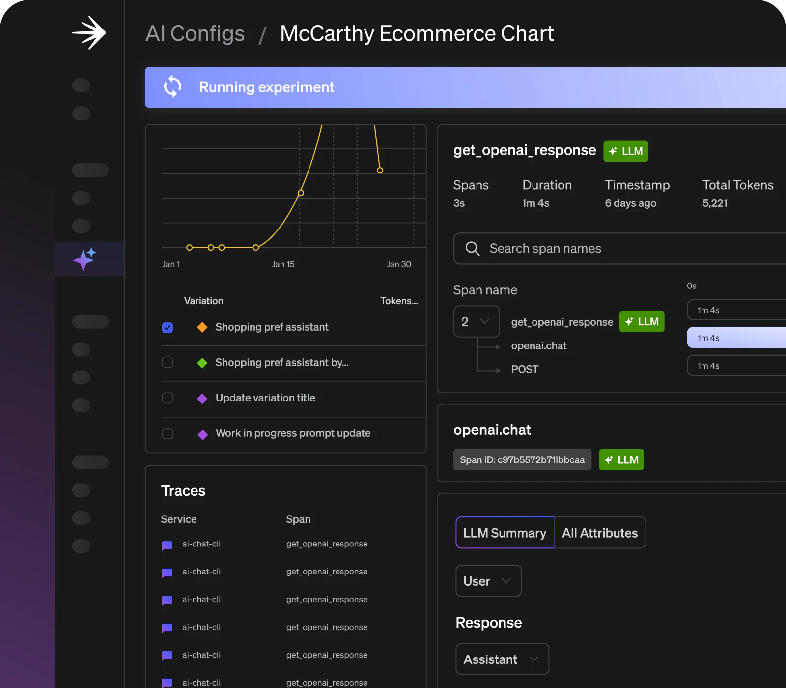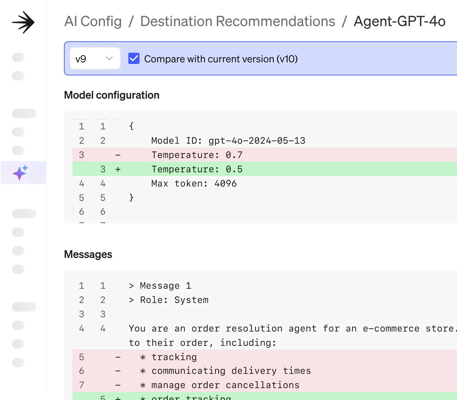 Follow completions, tool calls, and prompt flows; compare versions to see which change triggered the shift.