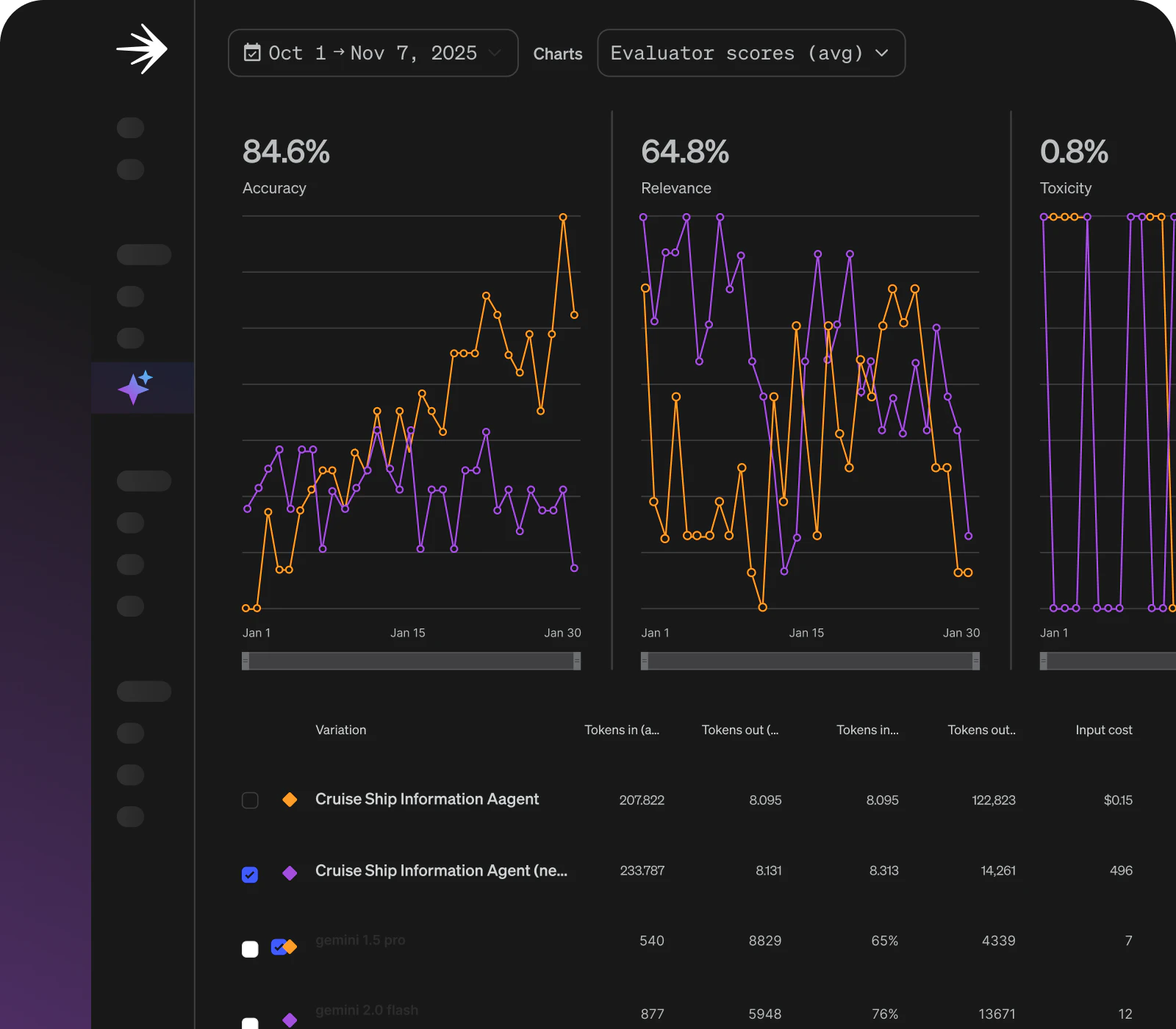 Judge scores, latency, tokens, and cost per configuration or version.