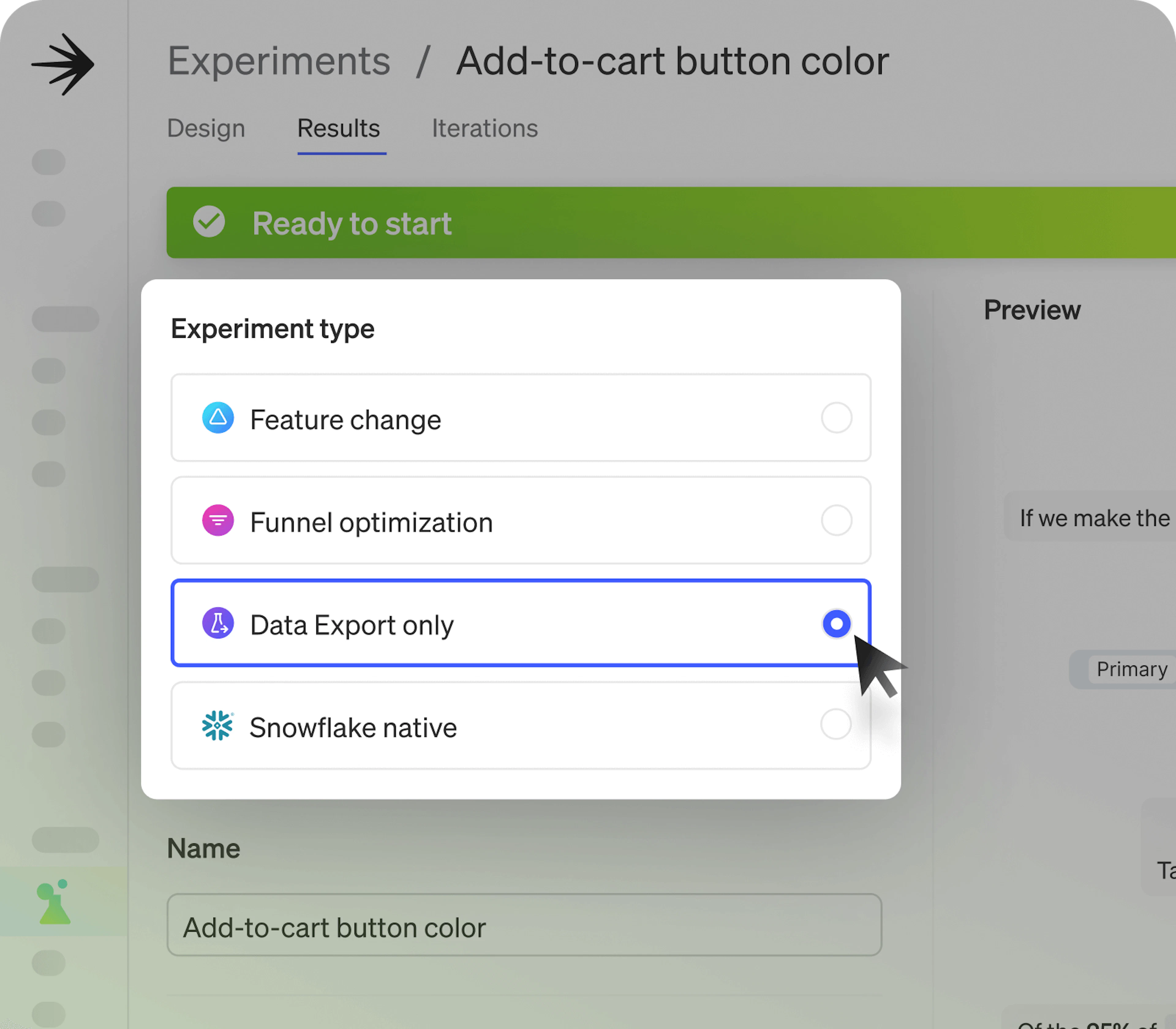 Export experiment results to your data warehouse for custom reporting and analysis.